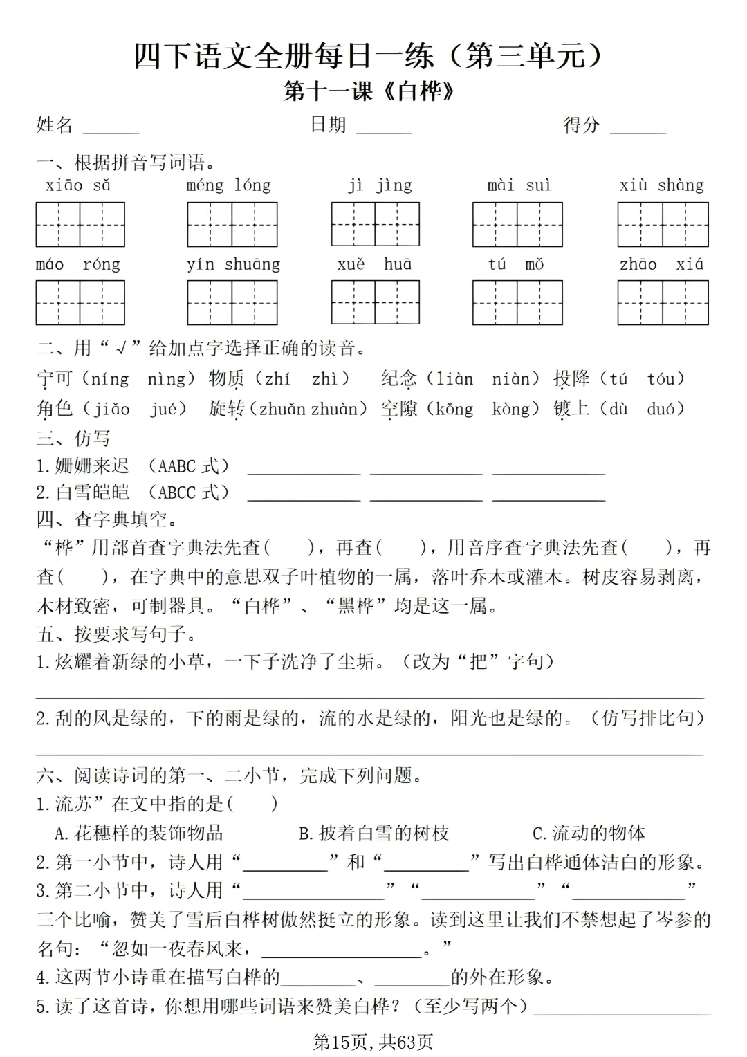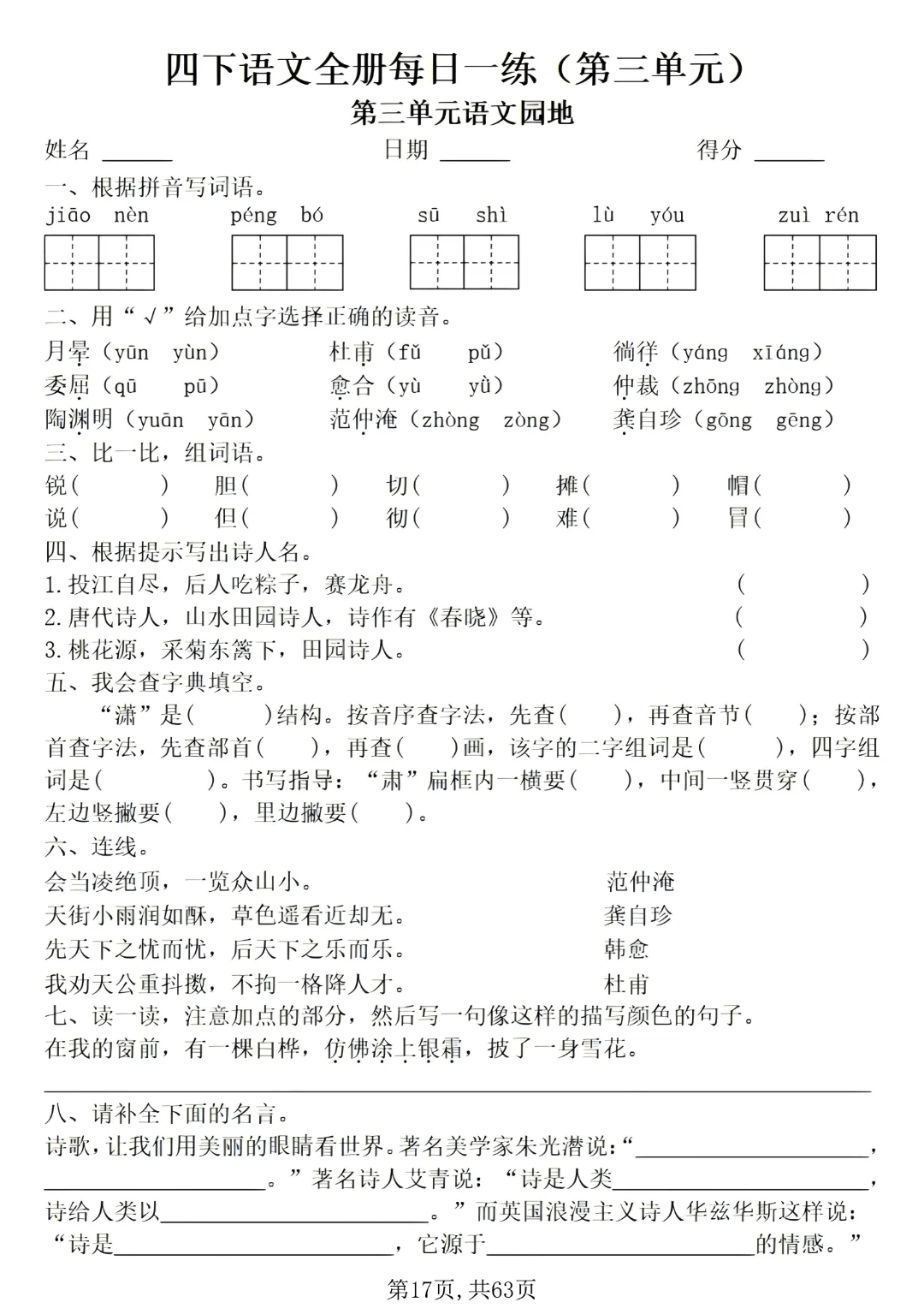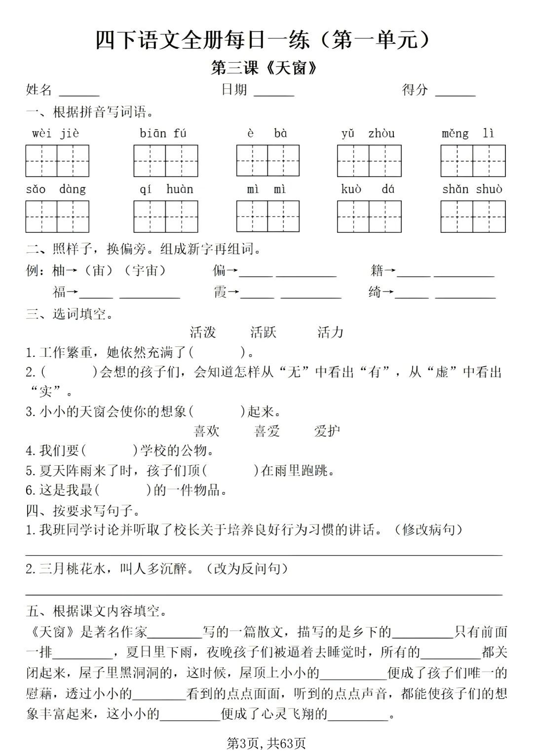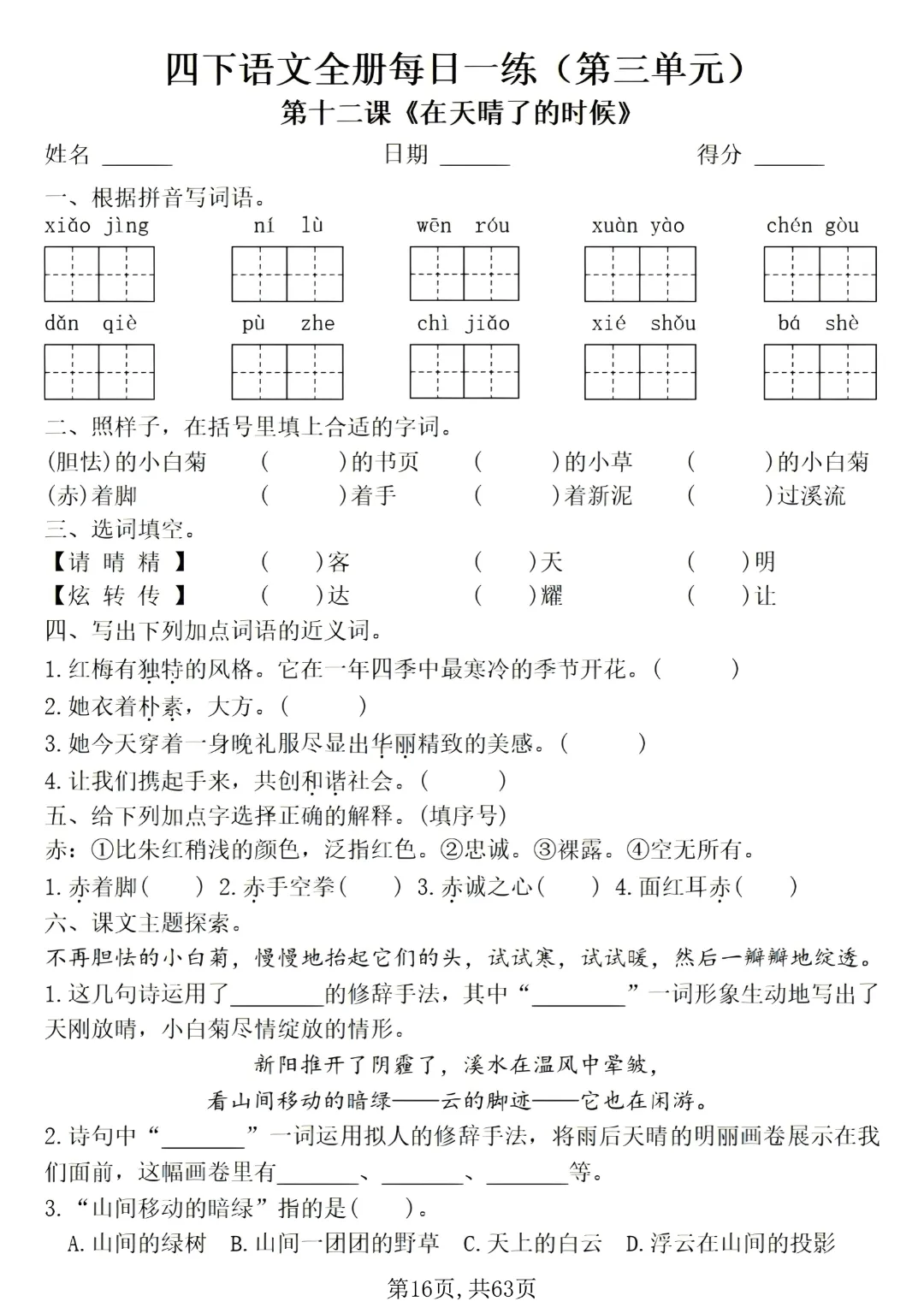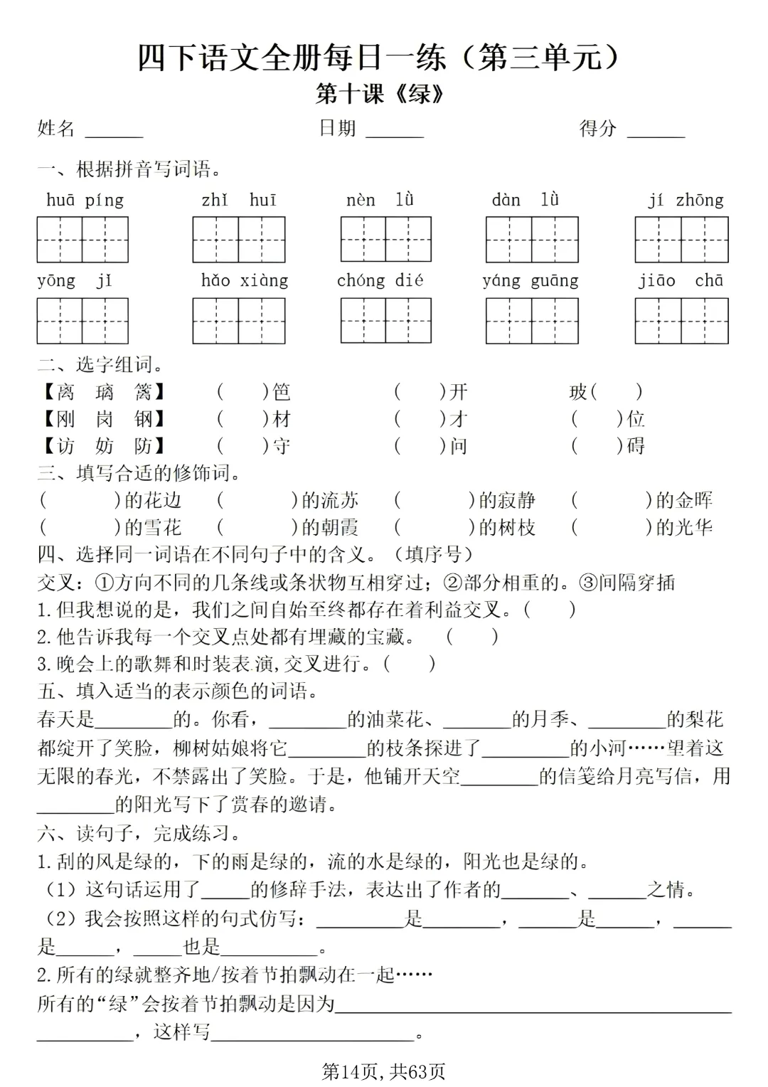 26年春四年级下册语文《一课一练 部编版》练习·学习必备·高清完整电子版可打印