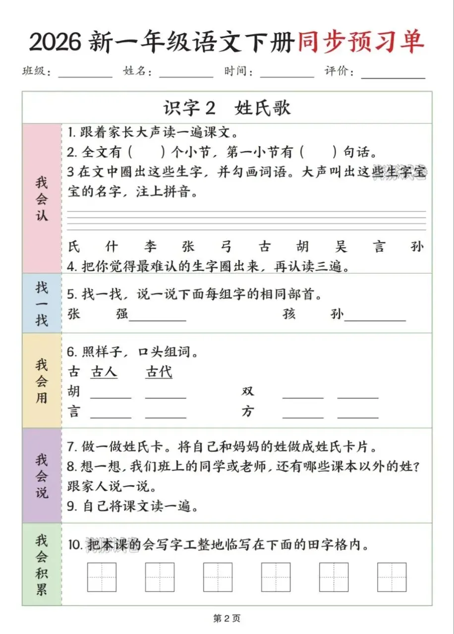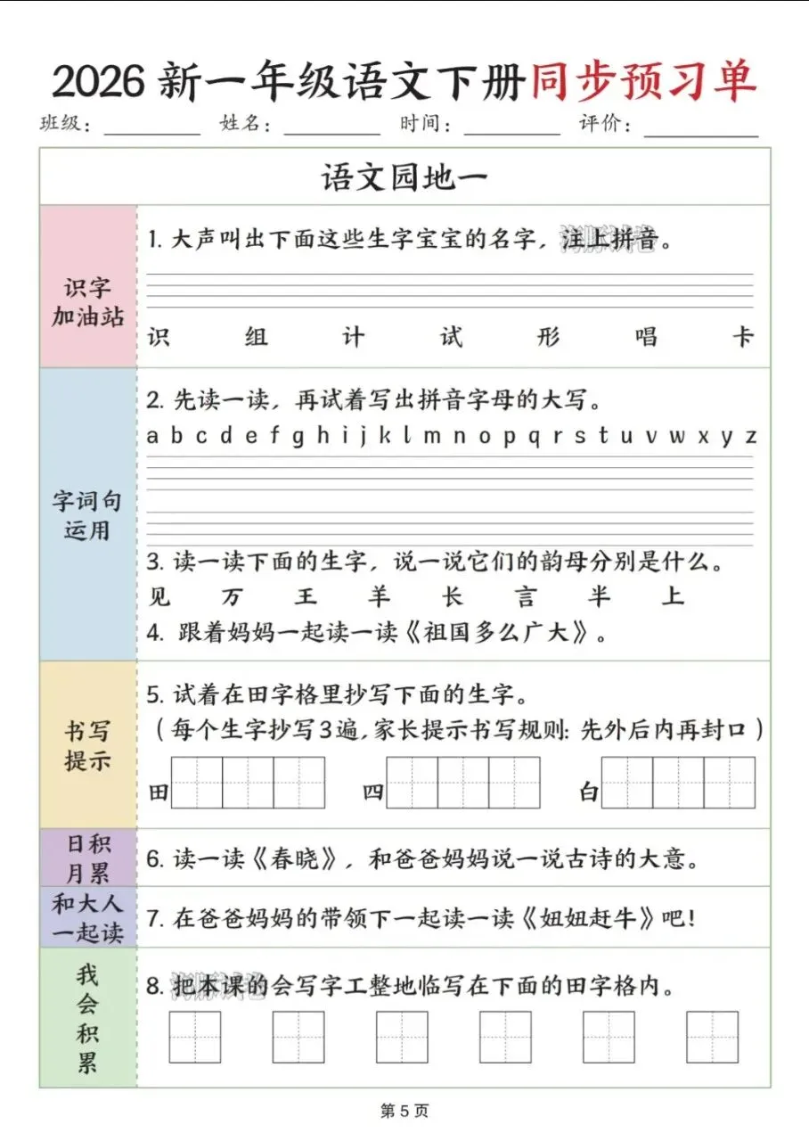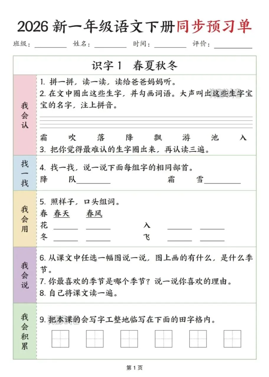 🔥一年级下册语文《全册同步预习单》来啦!