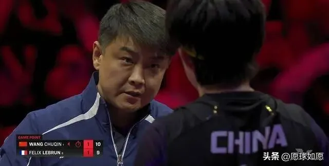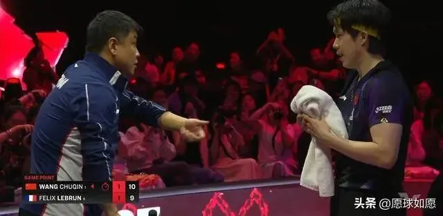 比较关键的第三局,王楚钦继续取得领先,然而却在4:0之后被追至5:4,此后王楚钦一度再次拉开两分分差,然而勒布伦非常顽强,本局在一直被压着打的情况下追至9:10,此时王皓叫下暂停,布置绝杀战术。