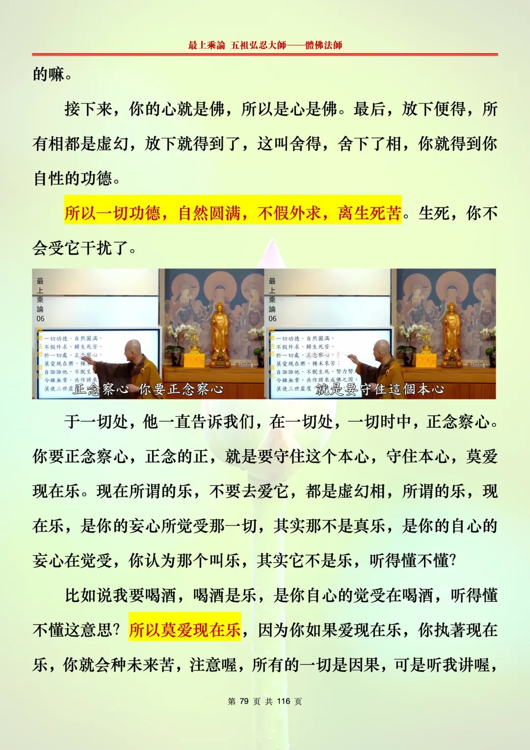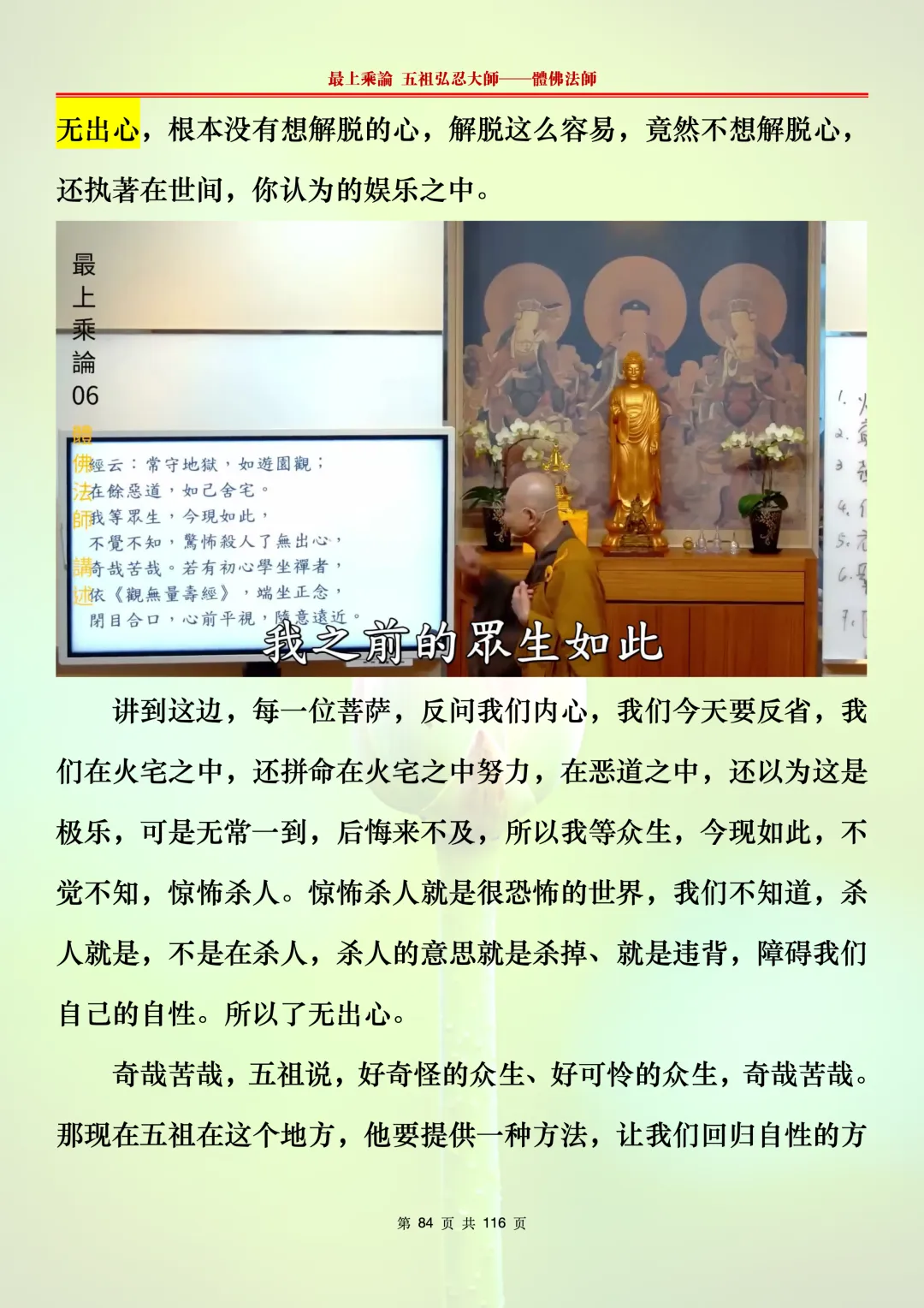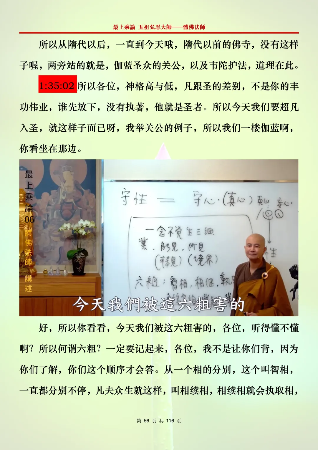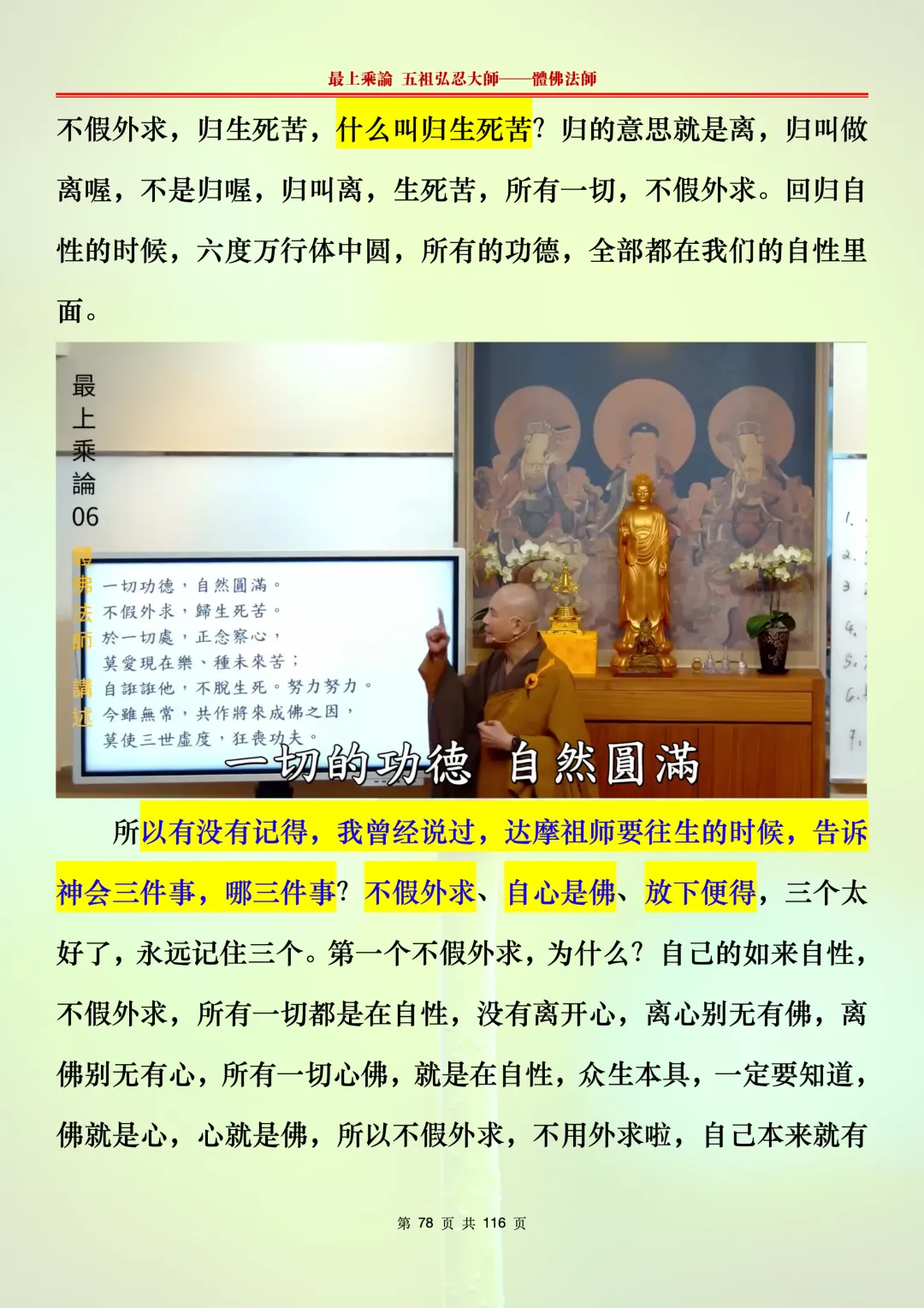 本文字文档,不出自禅院、不出自任何团队、不出自机器软件所提取的文字。本节课是个人依据法师讲解的视频,再依法师讲解的法义及语气,再根据个人的体悟,一句一句,对照视频而分成的段落,以及重点的标注。所标注的重点不代表本节课就是这样子,个人体悟不同,当然重点也就不同。文字文档,是方便没有时间观看视频的情况下使用,非作他用,大家时间充裕的情况下,重点还是应以法师讲解的视频为主。有时候一节课分成几段分享,是因为讲义时间比较长,而不得不分成两段或者三段分享,不代表什么。