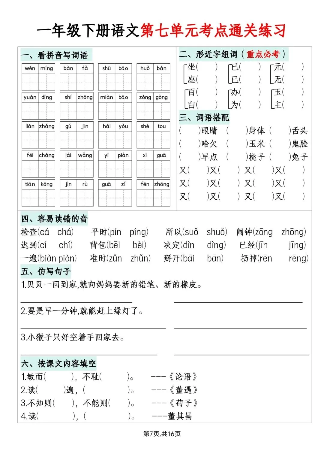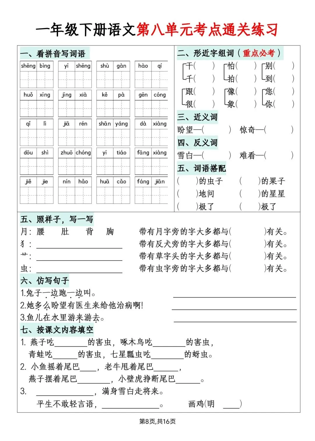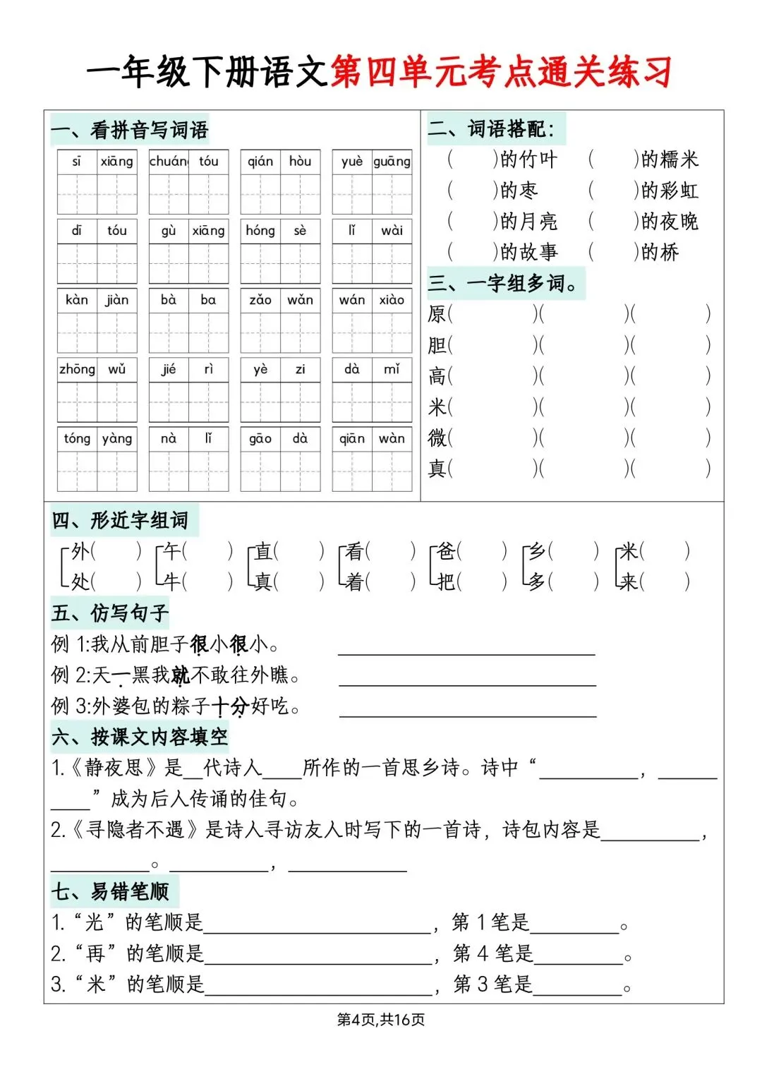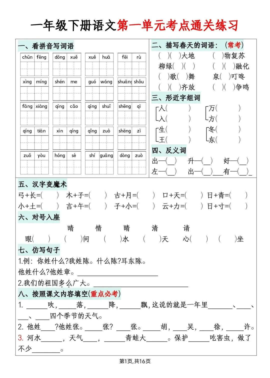 一年级下册语文单元默写通关练习高清电子版可打印