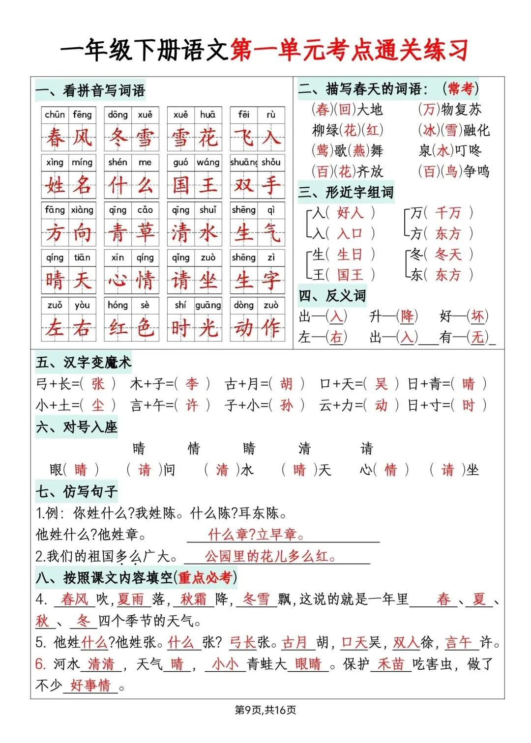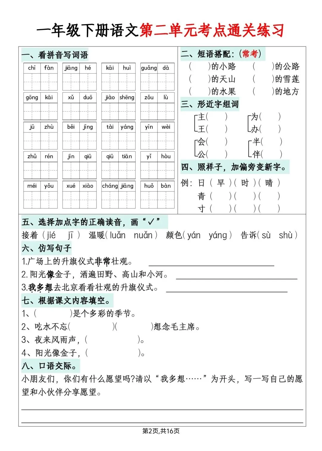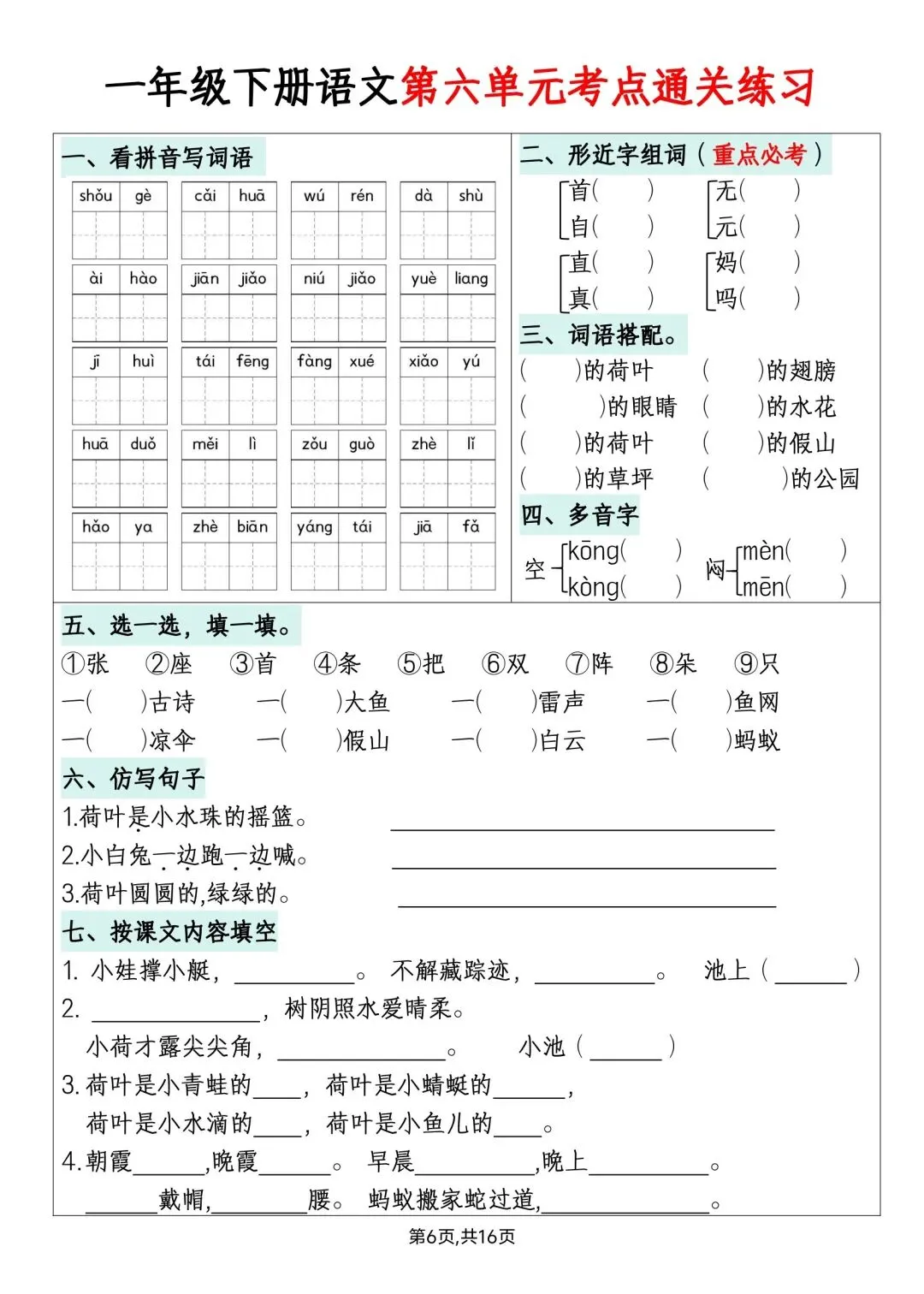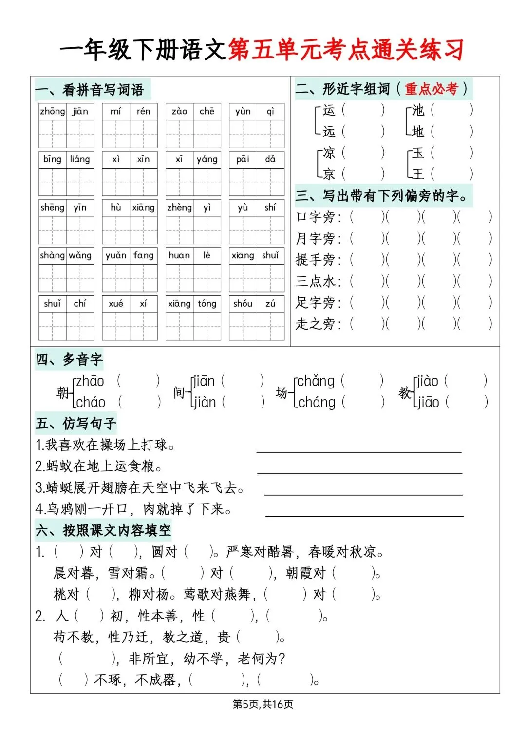 一年级下册语文单元默写通关练习高清电子版可打印
