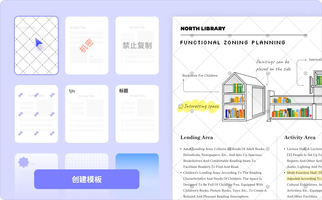 在多场景模板库内,可以找到丰富的水印、背景和页眉页脚等模板。支持直接使用,或单独创建自己需要的模版,办公效率更加分!