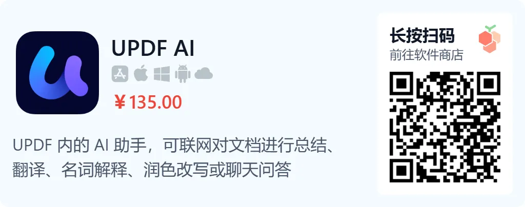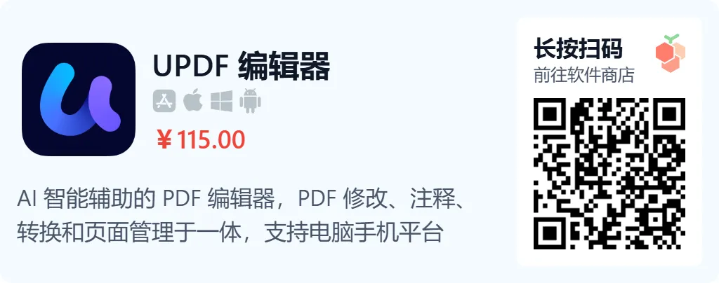 UPDF 编辑器是一款新生代 PDF 编辑阅读及转换软件,更有 AI 功能增强。文档打开阅读性能优异,适配多平台,搭配手机灵活扫描、注释签名,助力工作学习。
