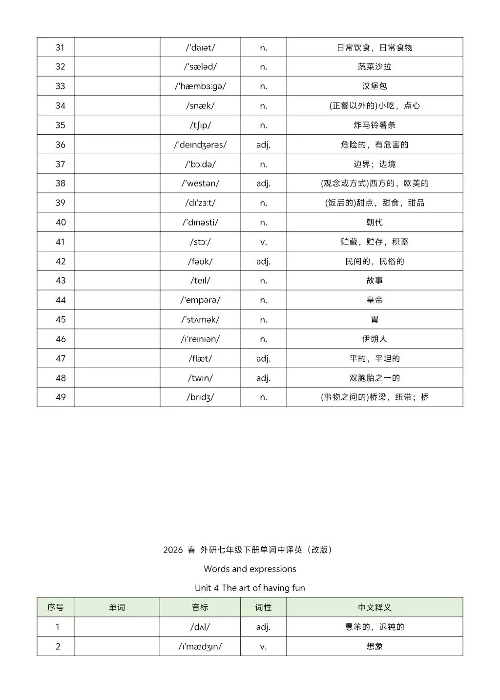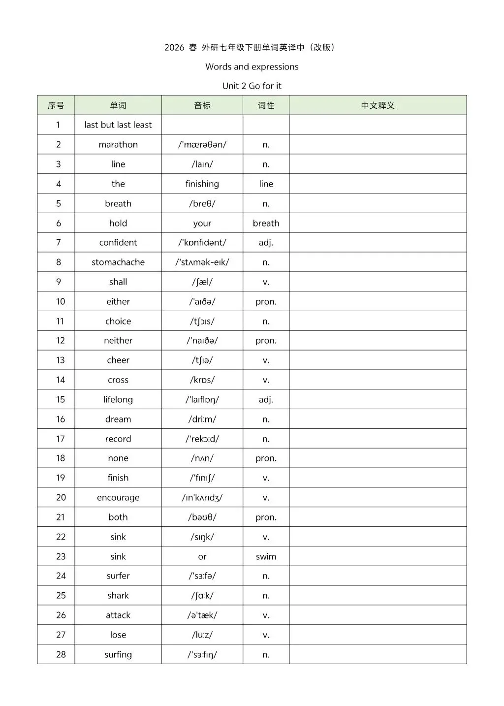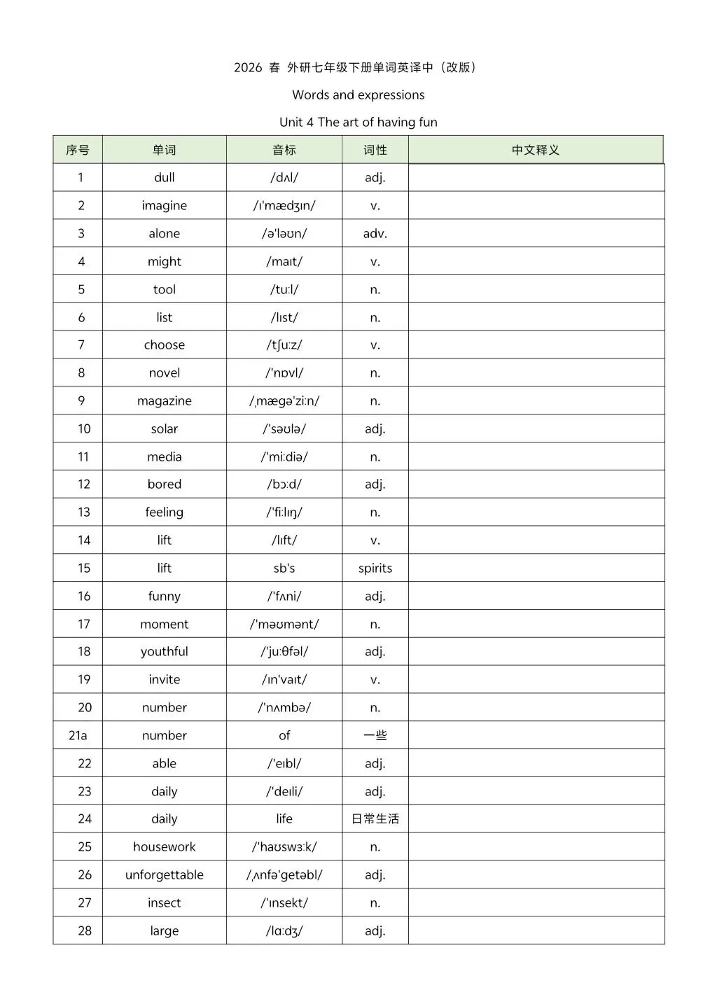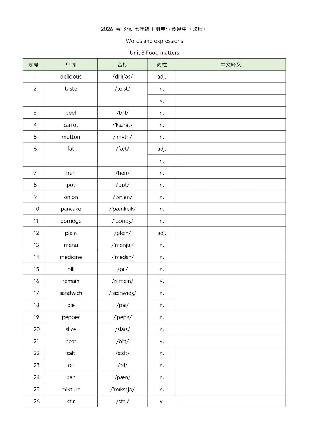 2026年七年级下册外研版英译汉汉译英单词 高清电子版可打印