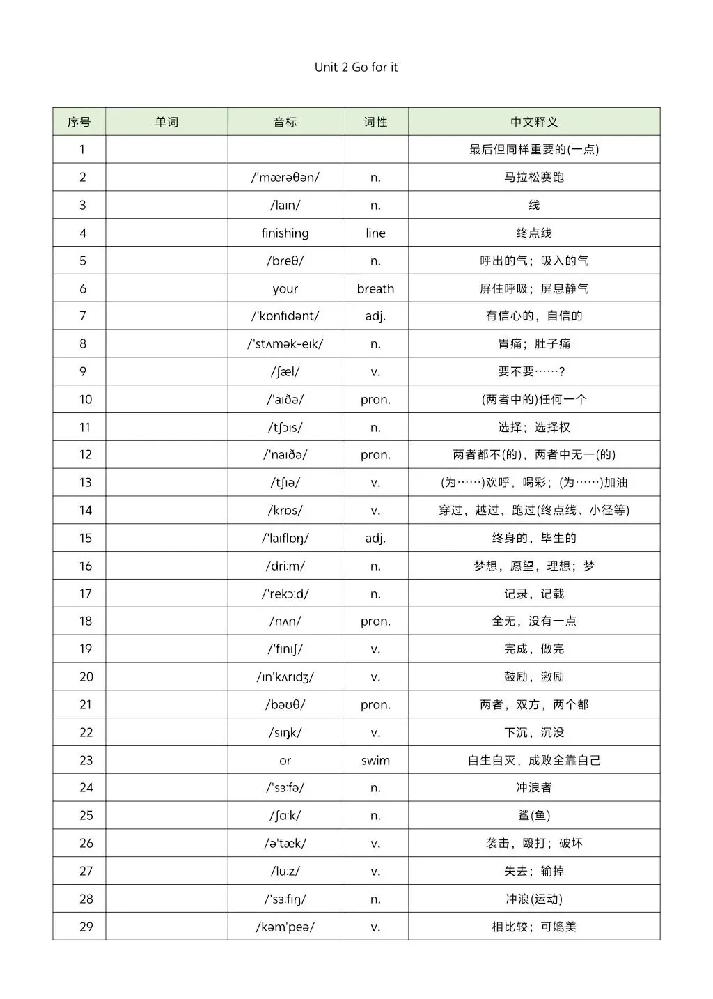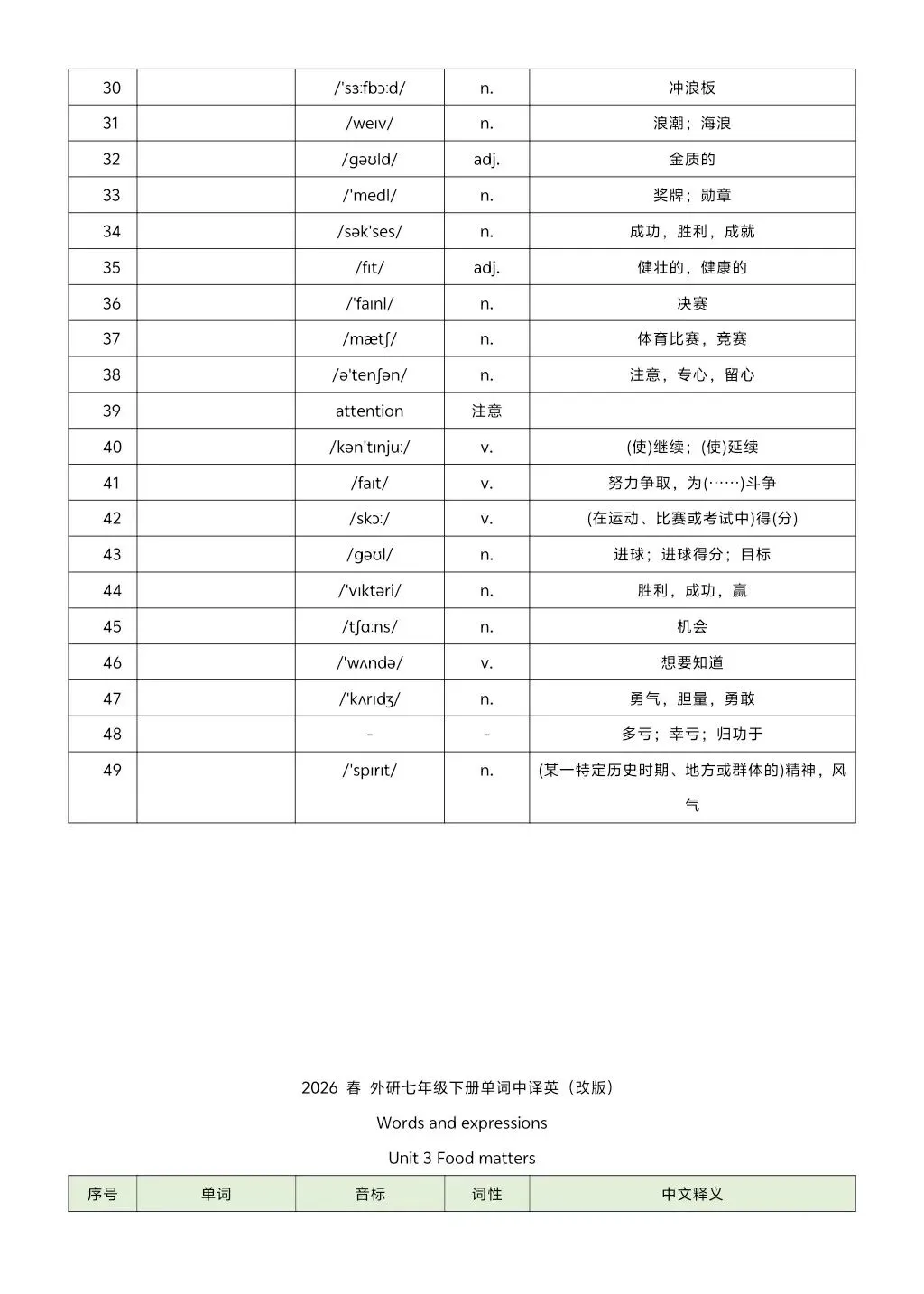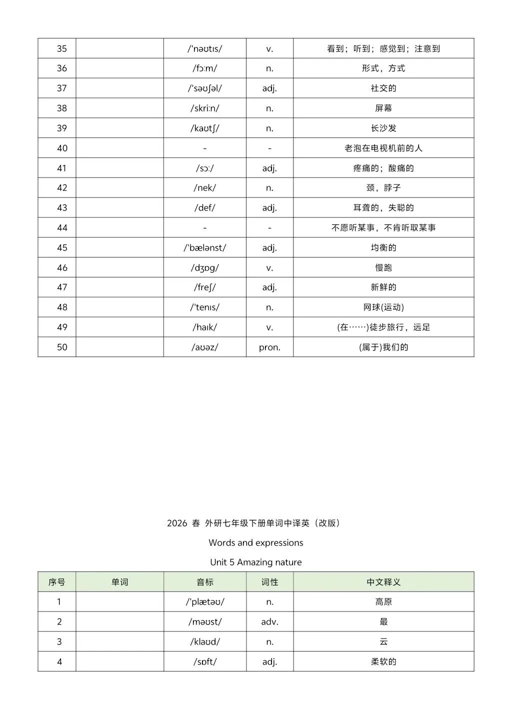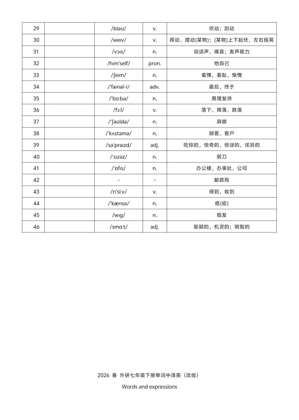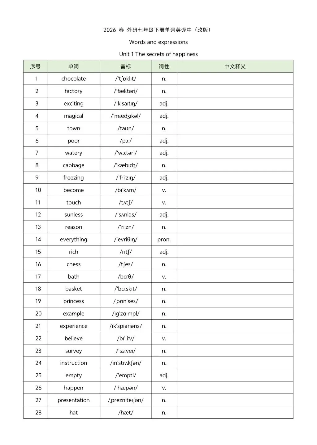 2026年七年级下册外研版英译汉汉译英单词 高清电子版可打印