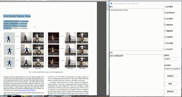 使用方法:打开网页或 PDF,Ctrl+C 复制要要翻译的本文,CopyTranslator 监听到剪贴板变化,会将剪贴板内容进行处理(如去除多余换行等),自动翻译,不用粘粘,并立刻给出结果。
