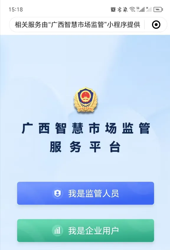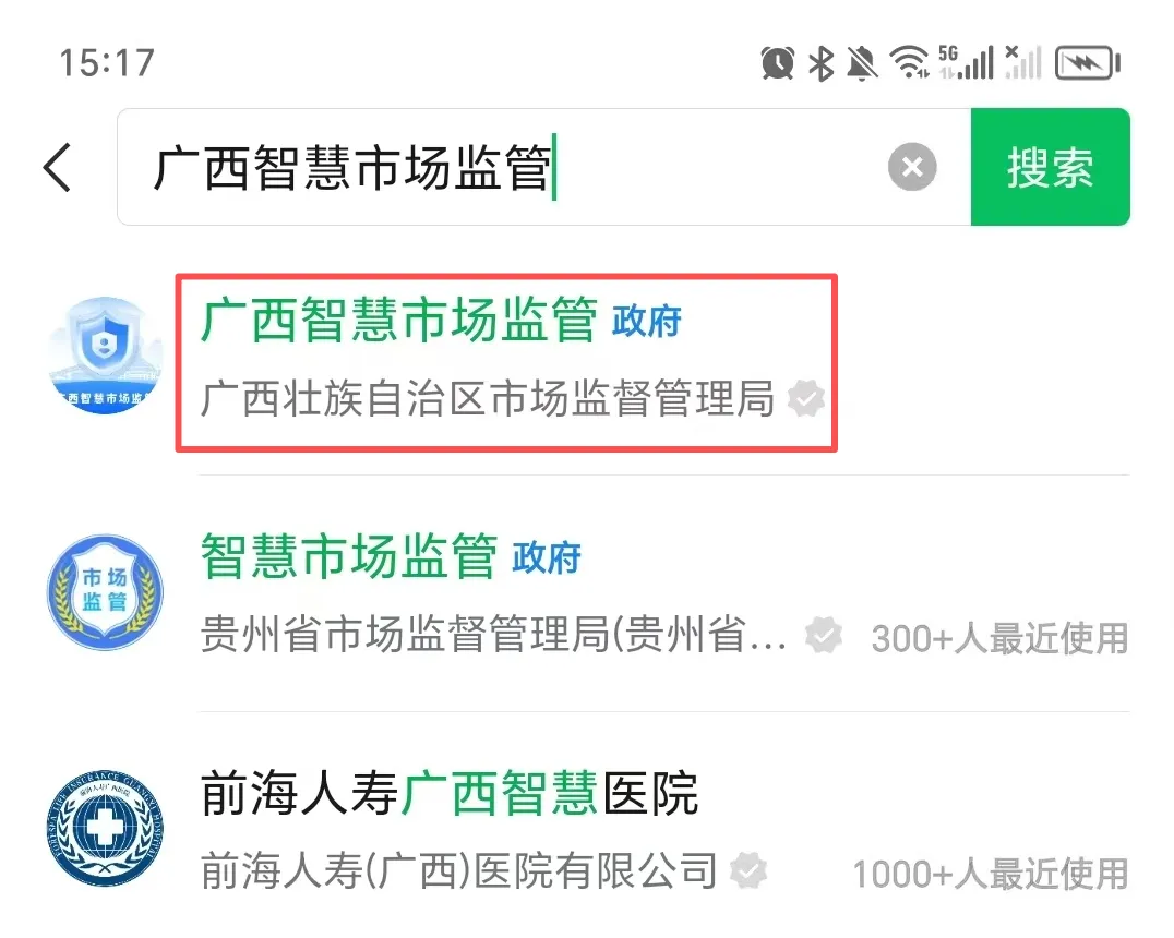 步骤1:在微信搜索“广西智慧市场监管小程序”。