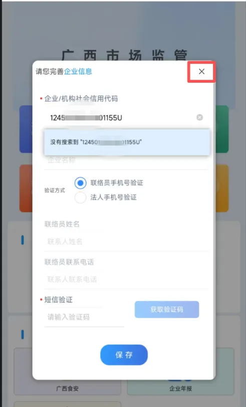 步骤4:从业人员新用户注册(原广西餐安APP没有账号),完善企业信息:输入社会信用代码或企业/单位名称->系统自动搜索企业/单位->从搜索结果中选择自己的企业/单位->系统自动显示法人和联络员信息(姓名、手机号)–从业人员通过法人/联络员提供的短信验证码完成用户与企业身份绑定。