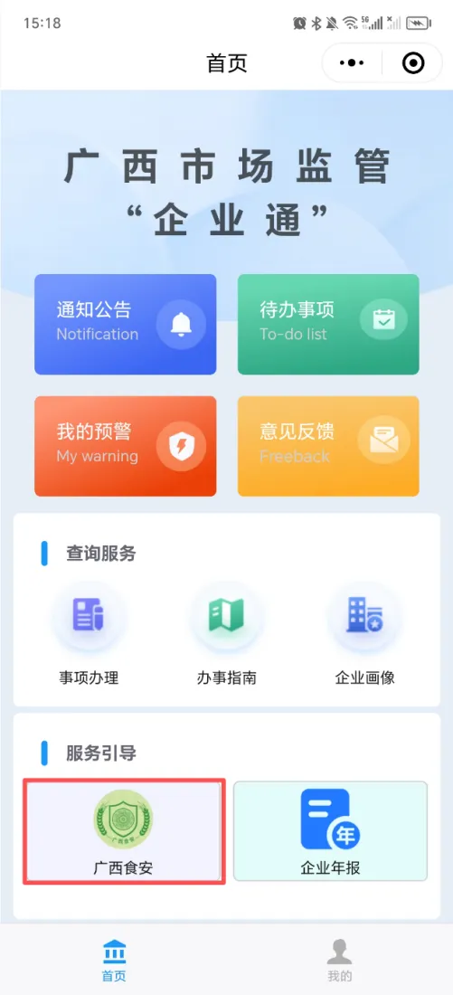 步骤6:从业人员在“企业通”首页,点击“广西食安”应用,进入“广西食安APP”系统。