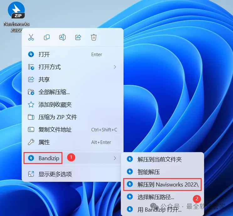 1、下载Navisworks 2022软件安装包到电脑上,右键选择【解压到Navisworks 2022\】