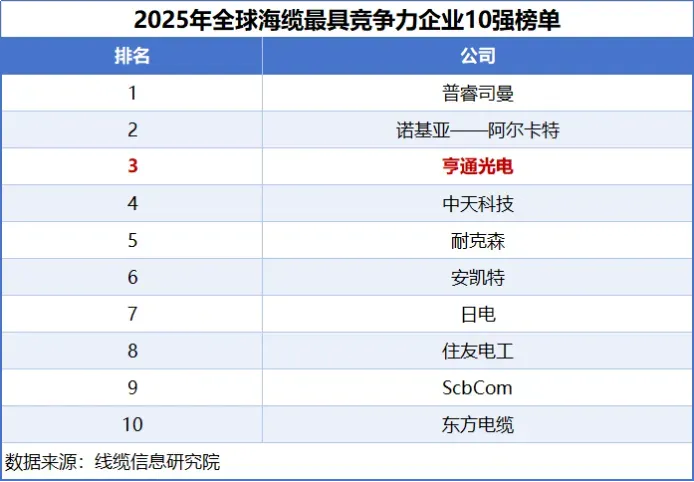 截至2025年12月,公司全球海底光缆签约交付里程数已累计突破108000公里。在《2025年全球海缆最具竞争力企业10强榜单》中,亨通光电位列全球第三。