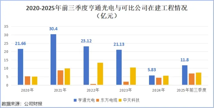 2024年,亨通光电的“在建工程”降至5.83亿元,主要是PEACE跨洋海缆通信系统等重大项目已完工转固。