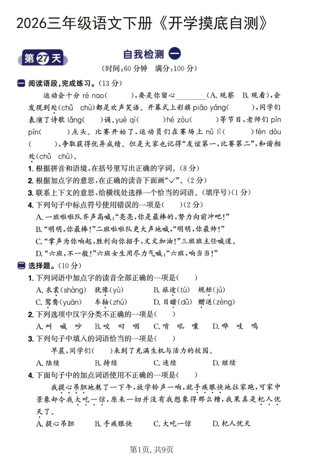 2026三年级语文下册《开学检测》,可下载打印 文末有高清电子版领取方式 由于篇幅有限,高清完整版请下载电子版哦 领取完整电子版方式: ①:发财的小手点一点右下角“👍”和“❤️” ②:关注公众号后,在对话框中回复:005 (点击名片可直接关注)↑↑↑