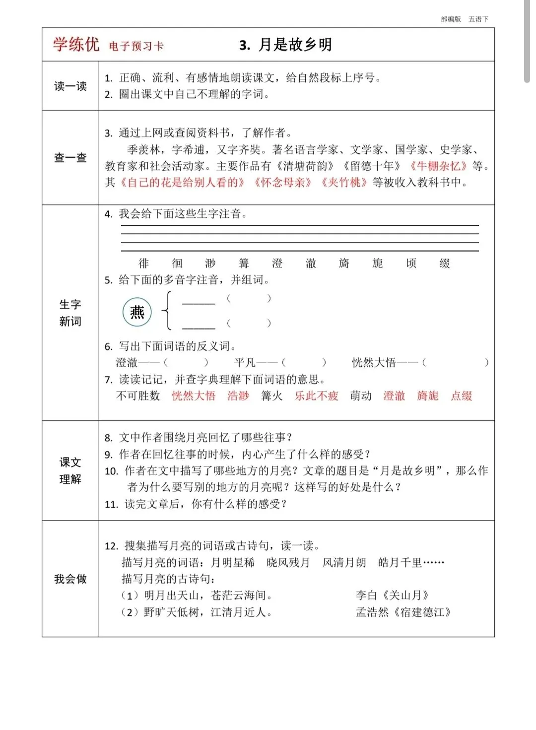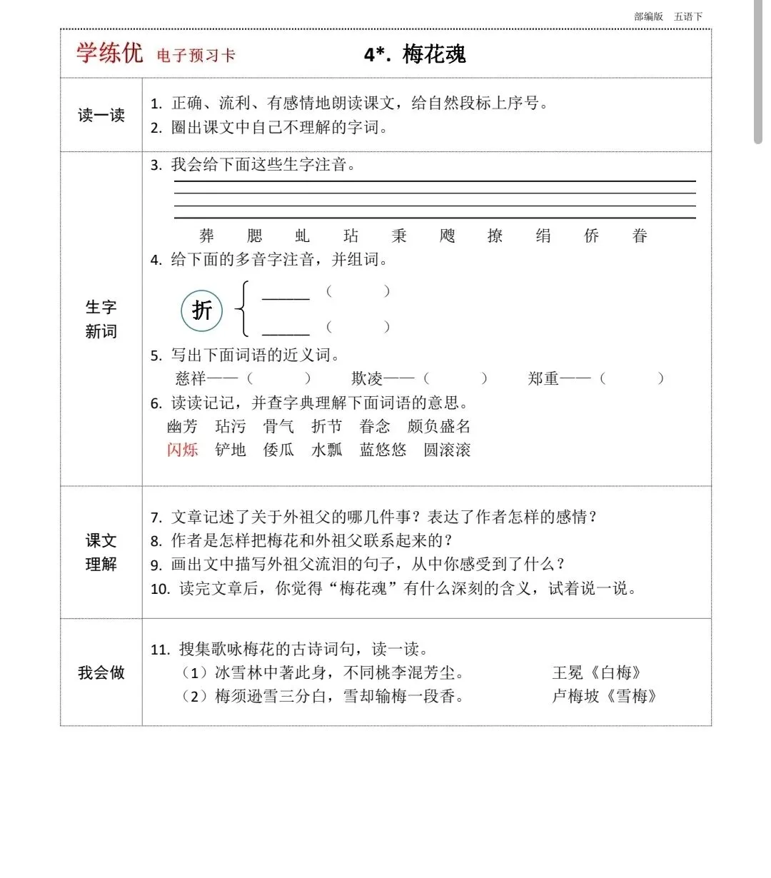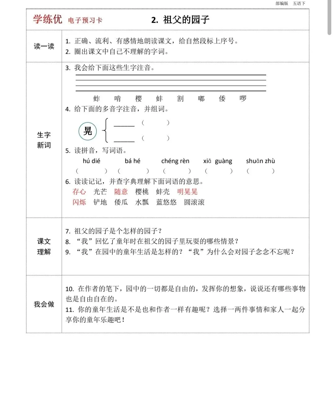 五年级下册语文全册预习卡(带答案,可打印)