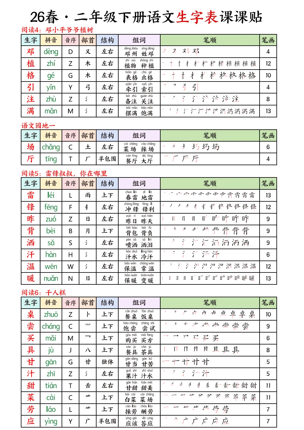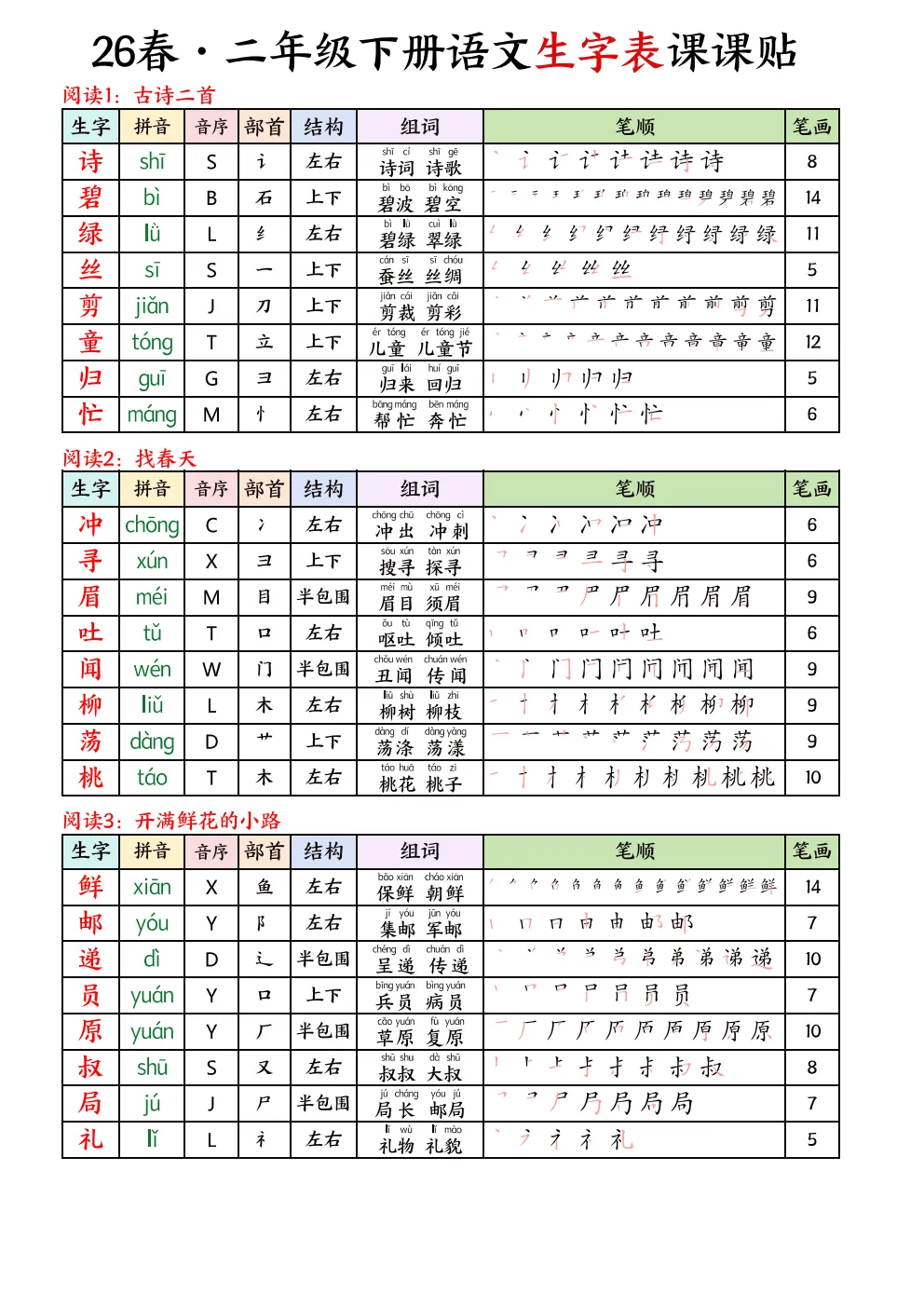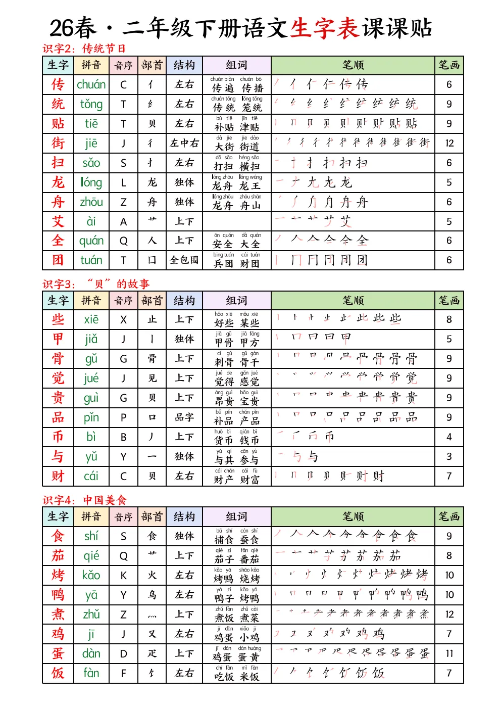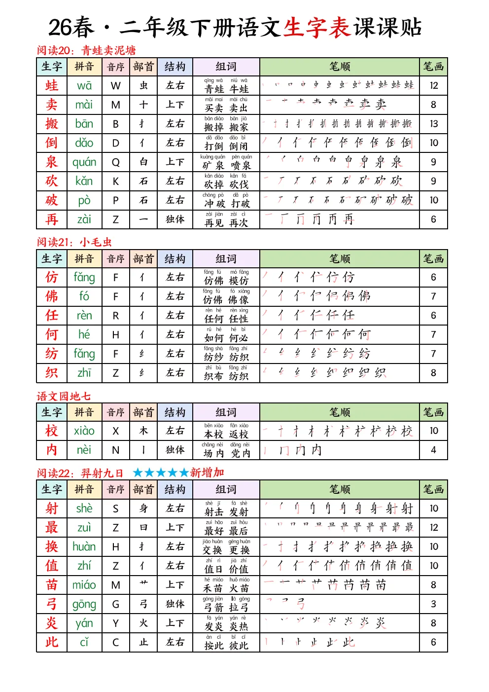 今天给大家分享:26春 二年级下册语文生字表课课贴|电子版可打印