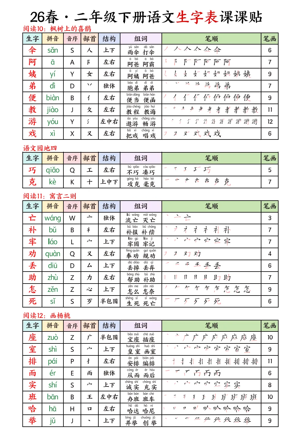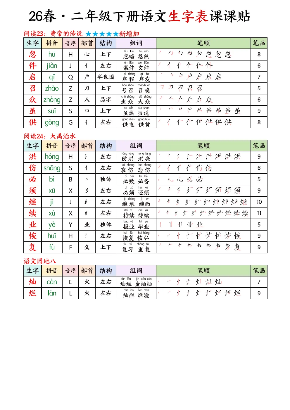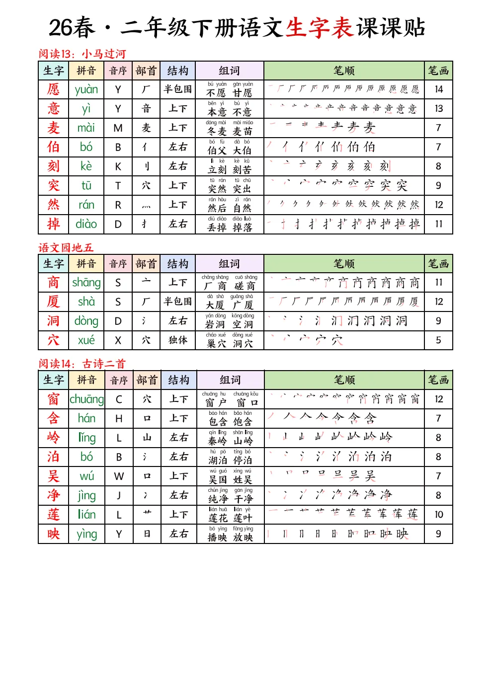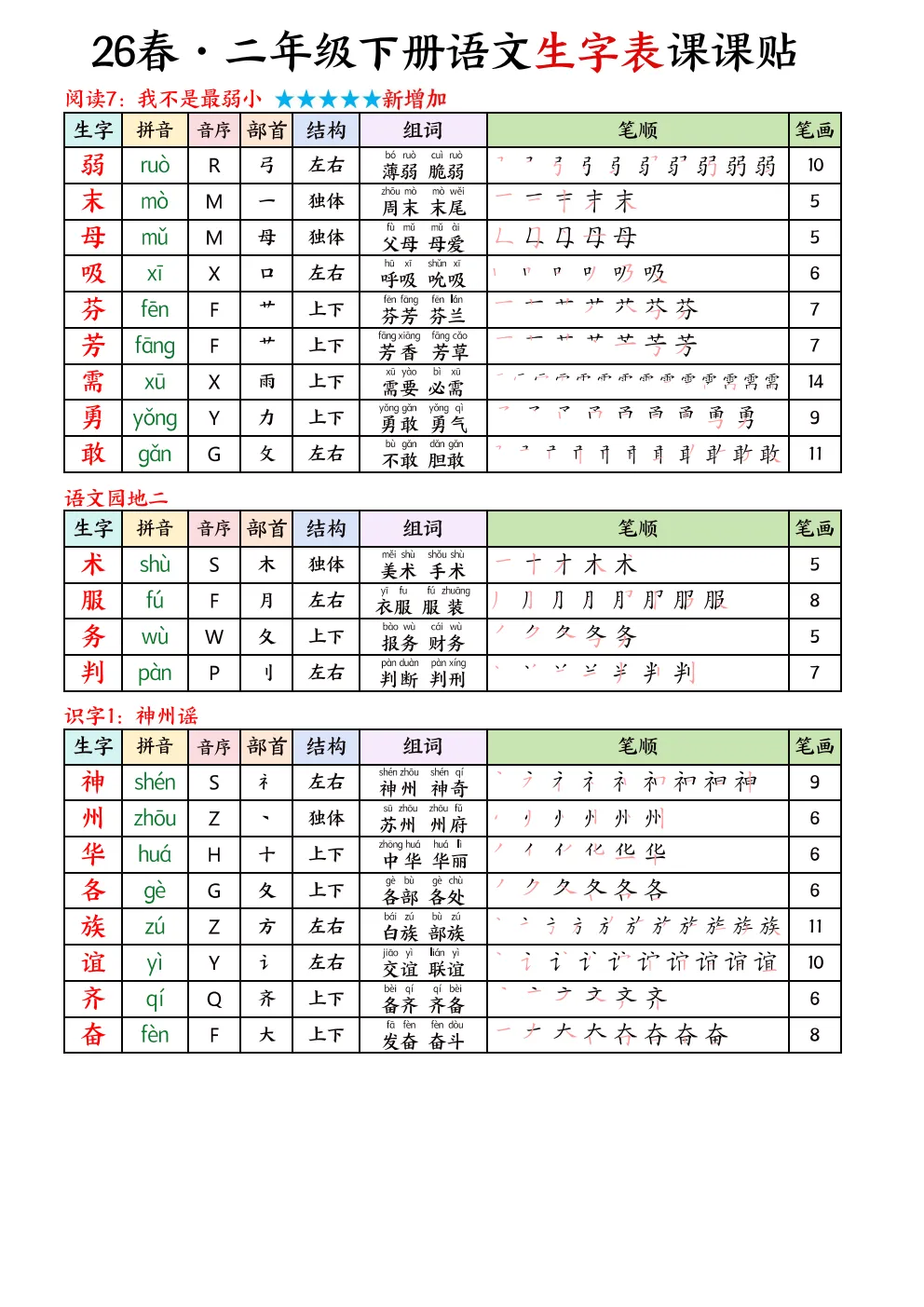 今天给大家分享:26春 二年级下册语文生字表课课贴|电子版可打印