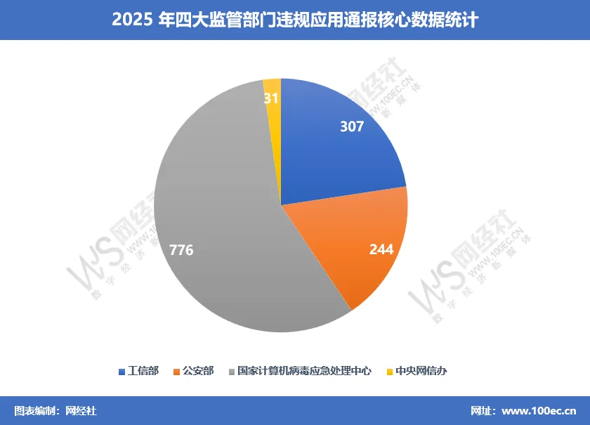 2025年,四大监管部委形成了差异化、互补性的执法格局:工信部聚焦用户权益侵害全场景治理,通报量位居首位;公安部针对恶意窃取用户隐私行为开展专项执法,形成刑事震慑;国家计算机病毒应急处理中心实现全类型应用常态化技术检测,覆盖车载、小程序等新兴场景;中央网信办针对SDK与头部应用开展专项整治,直指行业核心合规盲区。
