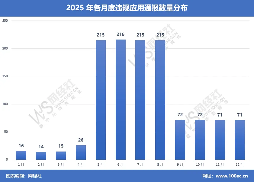 5-8月为全年监管高峰,4个月累计通报861款应用,占全年总量的63.40%,单月通报量均突破 200 款,其中 6 月以 216 款的通报量成为全年峰值,5月、7月、8月均达到 215款,四大部委联合发力形成了全年最强监管震慑;