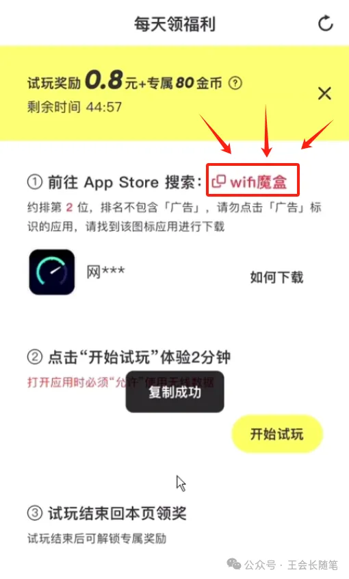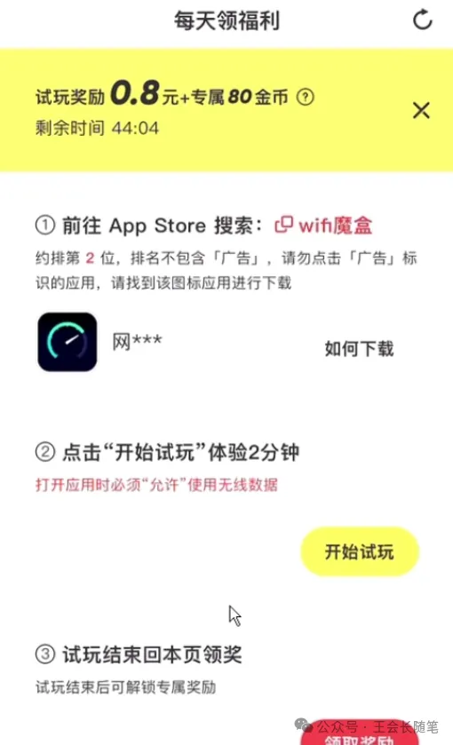⑤下载以后,打开应用,把网络权限打开。然后在任务平台点“开始试玩”,跳转到APP页面,停留两三分钟,不用注册,等就可以了