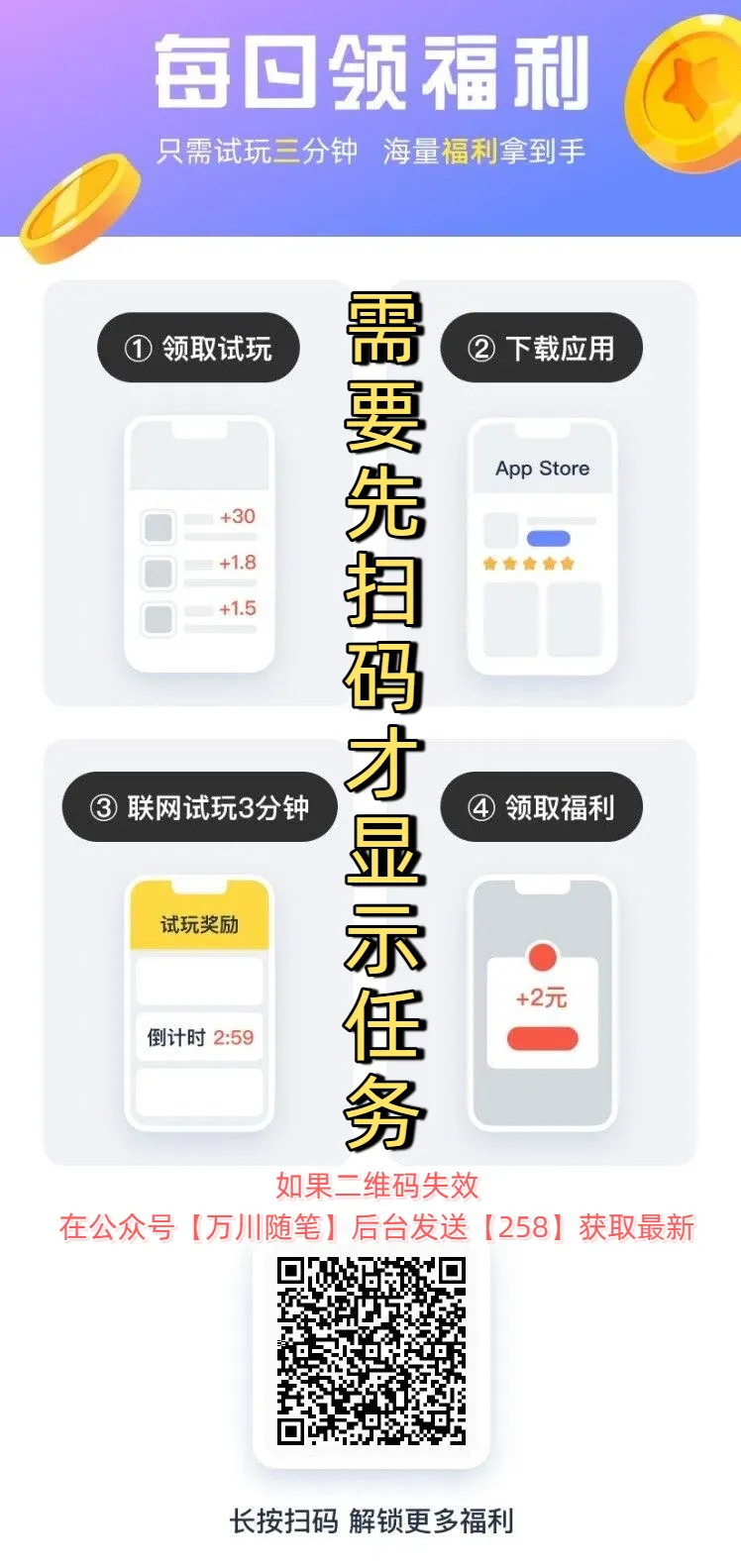 如遇二维码失效 and 更多任务平台,在公众号后台对话框里发送【258】纯数字,即可领取。我还整理了很多网创项目丨工具资源丨创作素材丨AI大合集等等,全放在我的百宝箱了,只需在公众号菜单栏里点“领百宝箱”,即可获取。