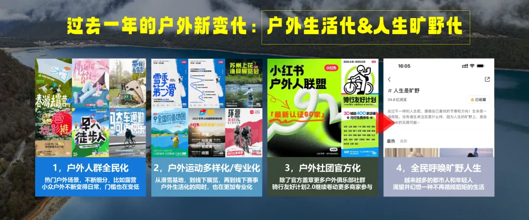 ✨ 过去一年,户外赛道迎来了全新变化:户外人群走向全民化,小众运动门槛持续降低,细分场景不断出新;户外运动愈发多样化、专业化,官方认证的俱乐部与线下赛事体系逐步完善;更有无数都市人被「人生是旷野」的理念打动,相关话题斩获 34.8 亿浏览,大家都渴望跳出循规蹈矩的生活,奔赴自然寻找松弛感。
