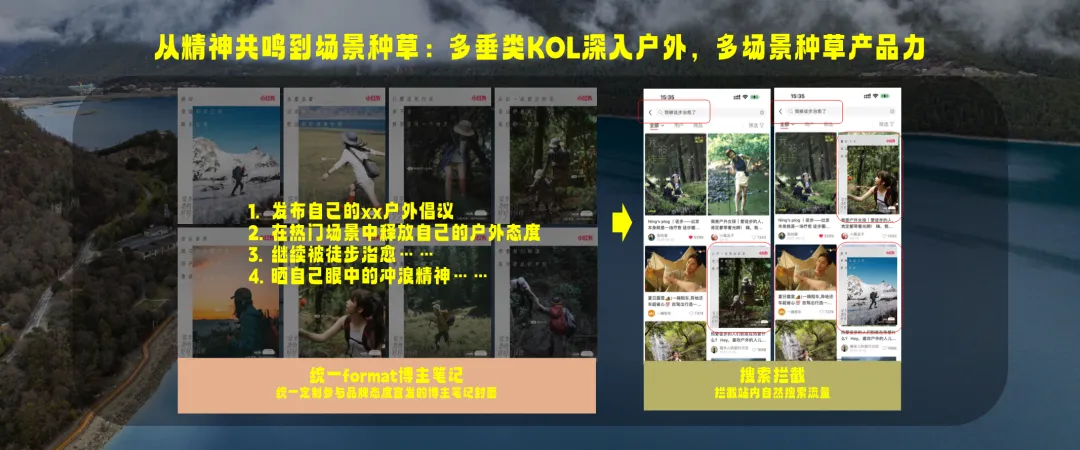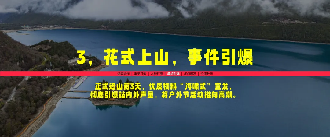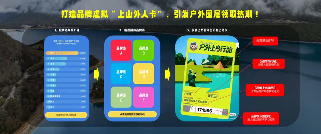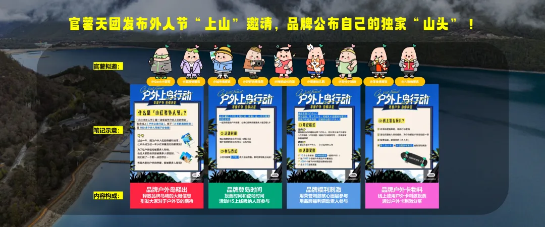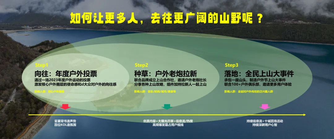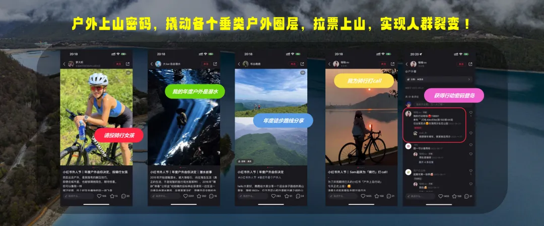 🎫 整场活动以「向往 – 种草 – 落地」为核心脉络,线上通过年度户外投票激活核心圈层,联动百位户外老炮打造深度种草内容,用趣味互动玩法实现人群扩圈;线下承包山野打造 48 小时户外社区⛺️,联动 100 + 户外俱乐部、落地 10 城百场活动,覆盖滑翔伞、皮划艇、徒步、藏地非遗体验等多元内容,划分城市户外、自然疗愈、在地文化三大主题板块,让新手和老炮都能找到适配的户外玩法。
