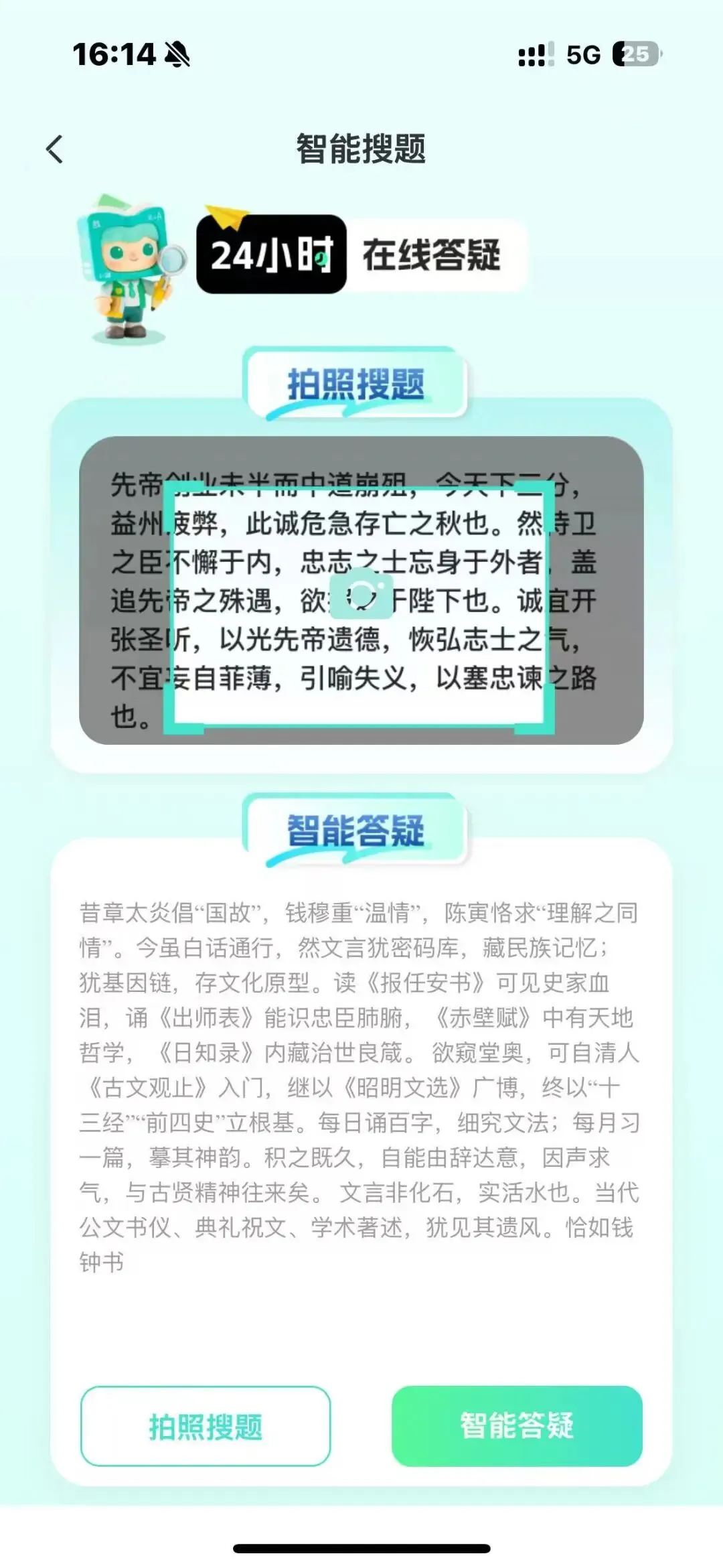 拍照搜题:点击相机图标,拍摄题目照片(确保清晰无遮挡),系统自动识别并解析。