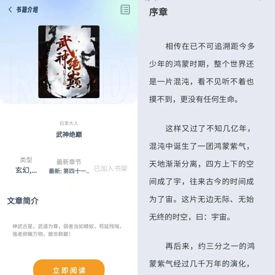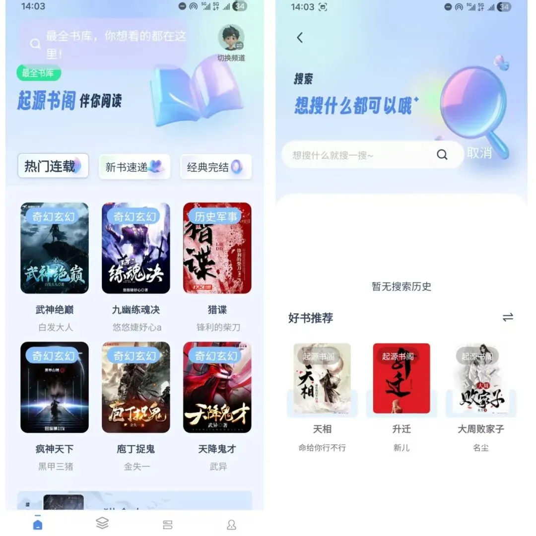 大家可以看到,软件一打开就能看到最近的热门连载,新书和经典完结,除了这些,还能随意搜索你想要看的小说(右图)。