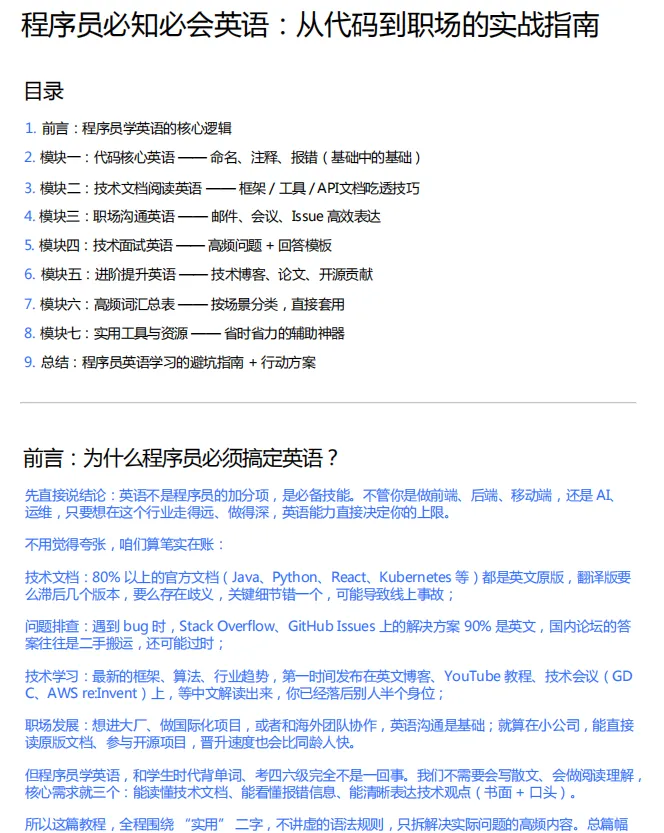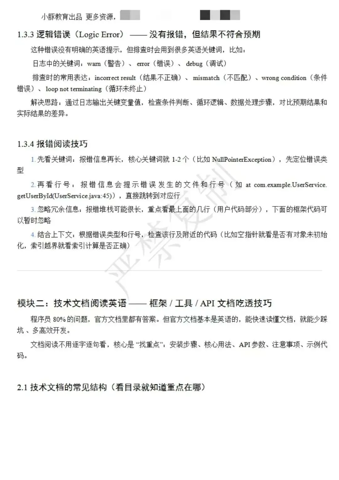 它打破了一个误区,读懂技术文档其实不需要托福雅思那种大而全的英语能力。它非常精准地把那些高频出现的术语、固定的句式结构提炼了出来,提供了一个极具针对性的切入点,帮我快速跨过了看懂 70%-80%的门槛。