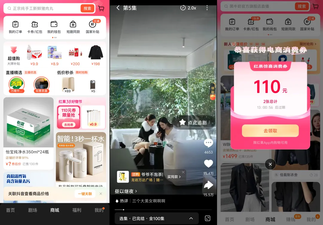 除此之外,红果短剧内已经出现剧集中挂团购、购物链接的情况,点击后会跳转至APP内的商城页面中。相关用户还被推送了仅限红果APP内使用的“电商消费卷”,疑似在为红果APP内的商城做拉新与留存。