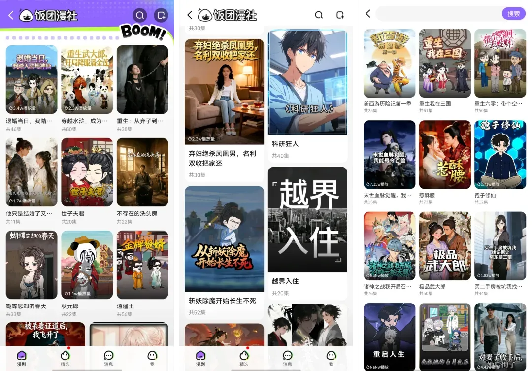 目前,美团APP给站内的漫剧板块命名为“饭团漫社”,整体页面设计相对简洁,不显示作品播放量,也暂未设置任何榜单。内容上,目前上线的作品题材覆盖较广,但多以沙雕漫和AI真人解说类内容为主,AI漫剧数量相对较少,首页上多部剧几乎没有互动数据。