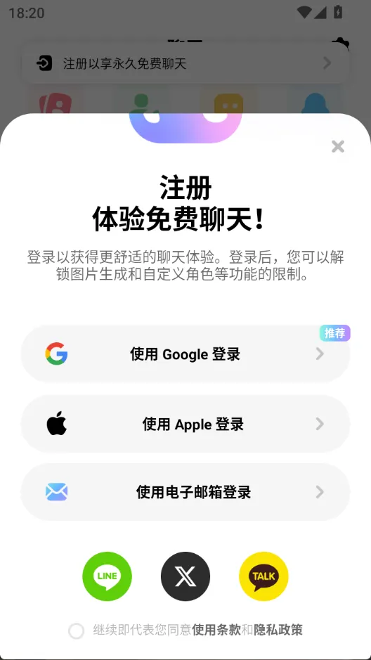 而且它真的很良心!注册就能永久免费聊天,登录后还能解锁图片生成和自定义角色,Google、Apple、邮箱甚至 LINE 都能登,对咱们国内用户也很友好。