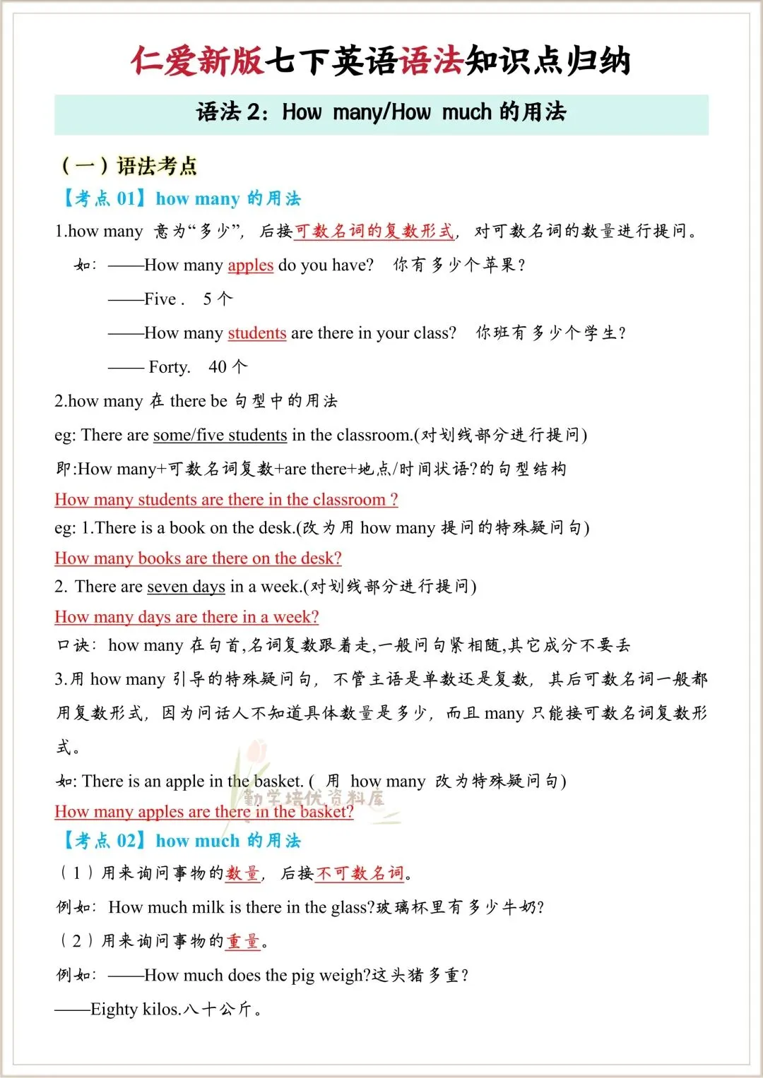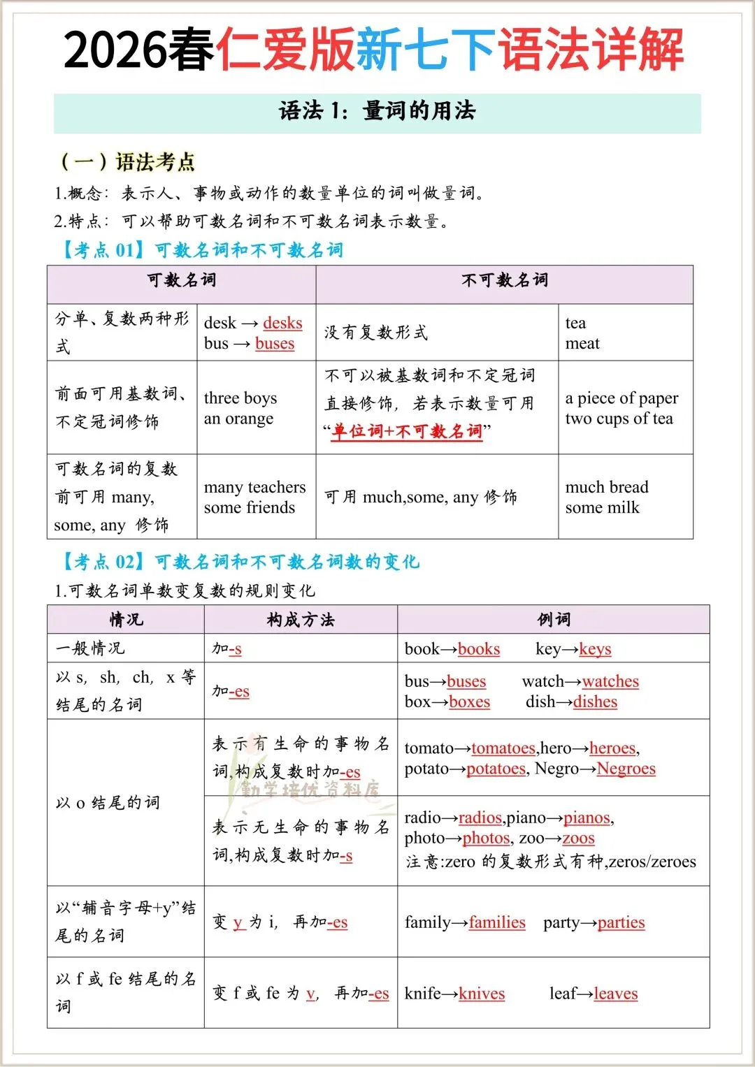 今日老师精心给大家整理了: 新版教材|2026新(仁爱版)七年级下册英语全册必核心背记语法知识点总结(语法详解),电子版可下载打印!