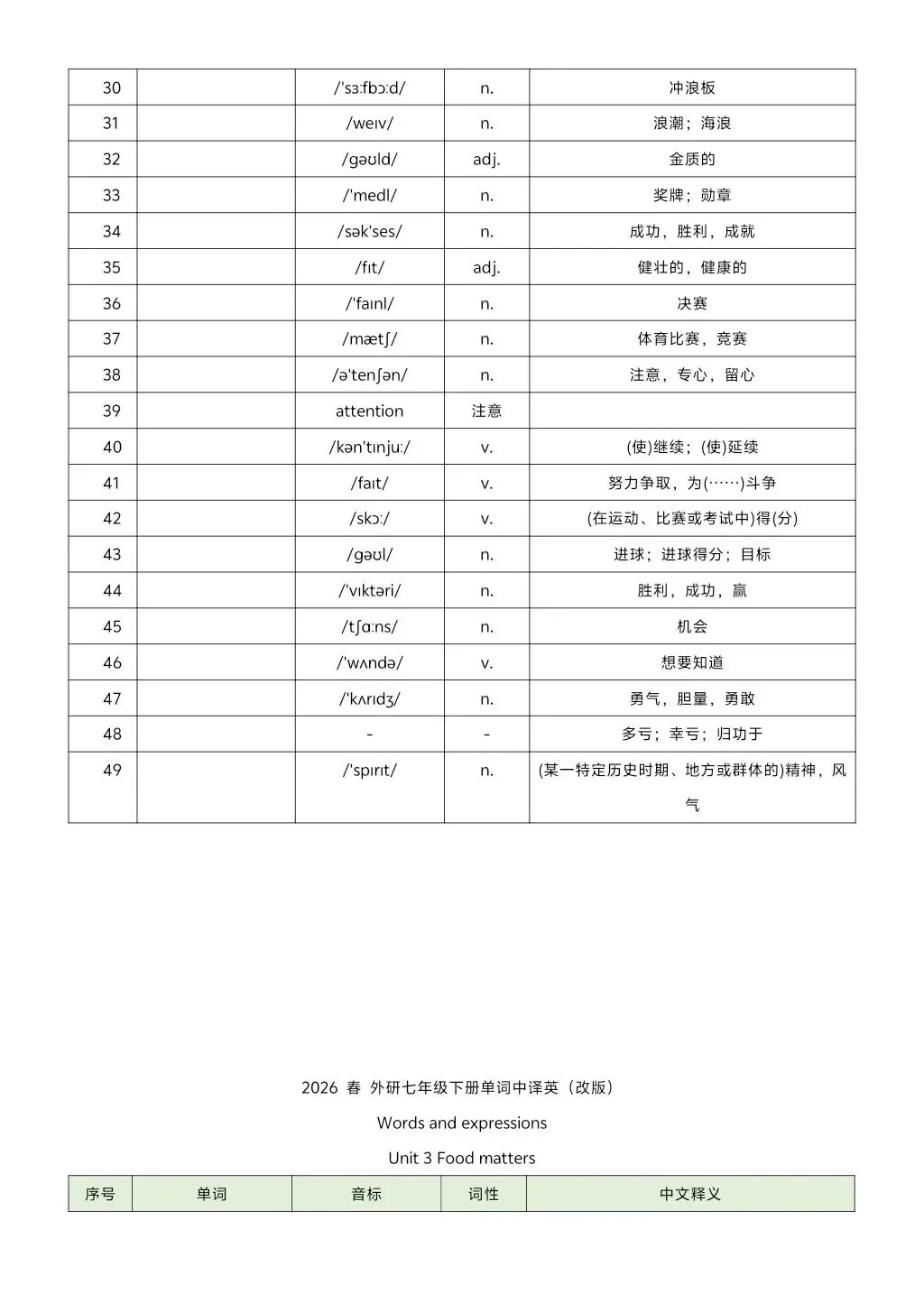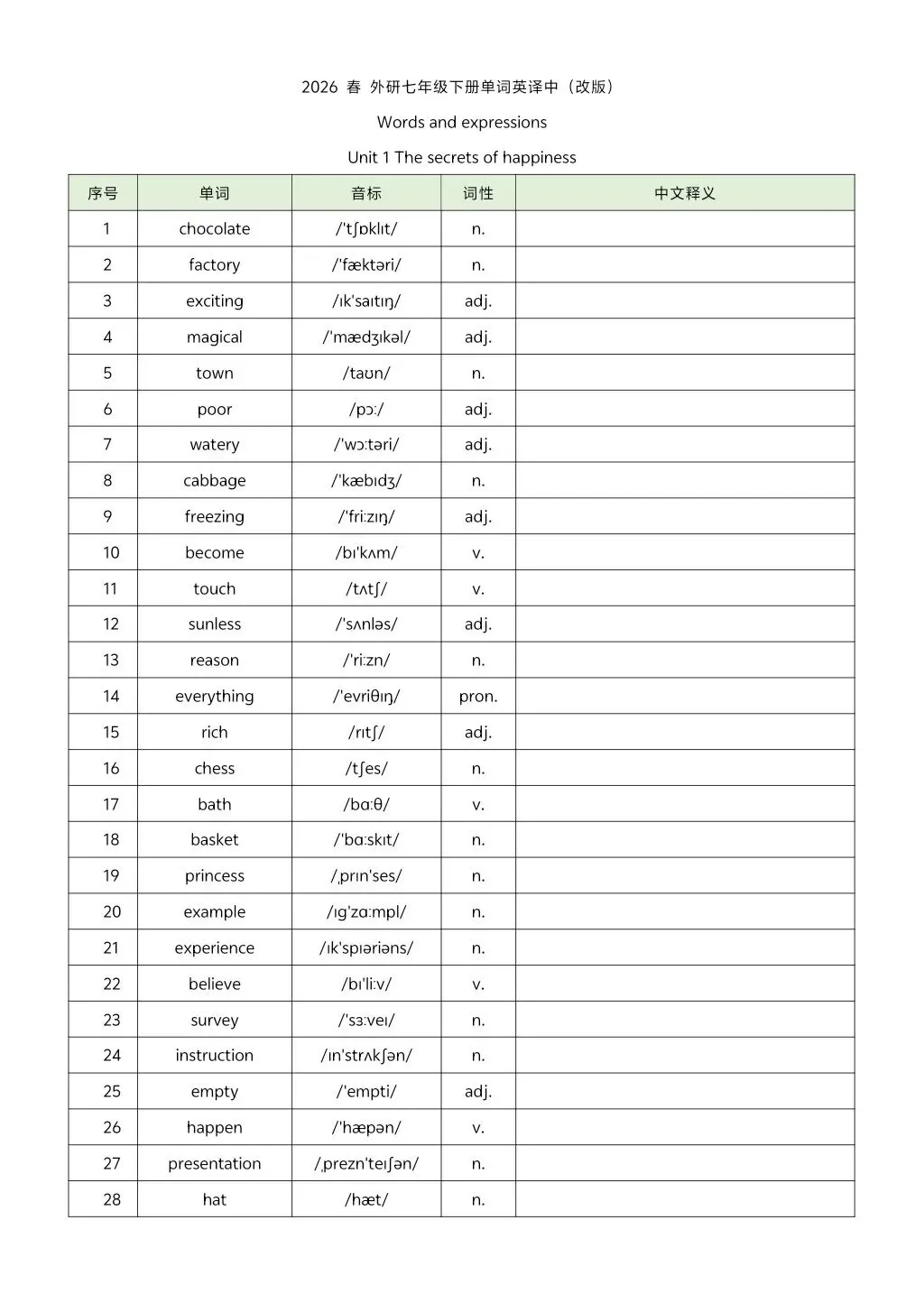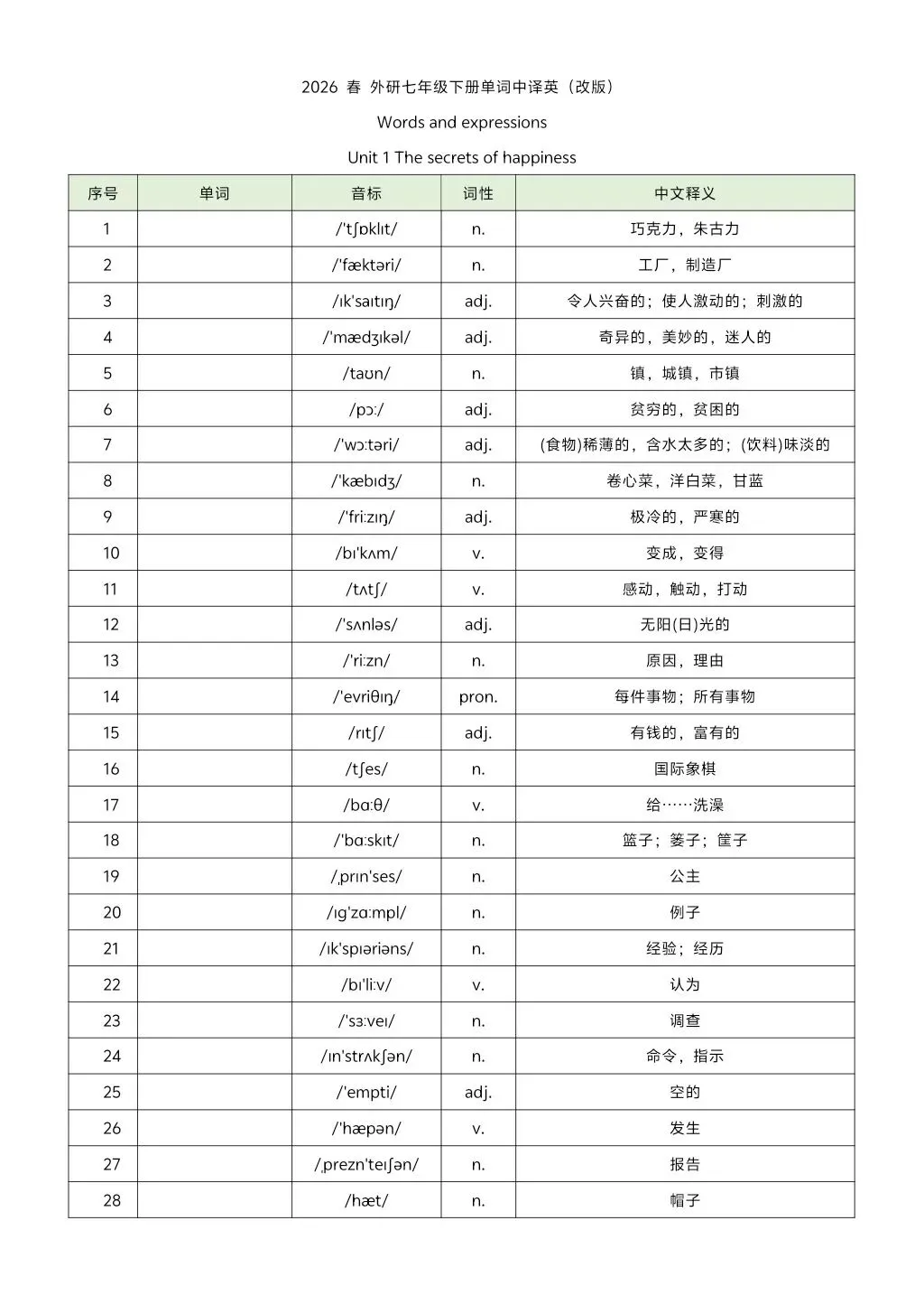26年春七年级下册外研版英语单词表【汉译英+英译汉】,完整高清电子版可打印