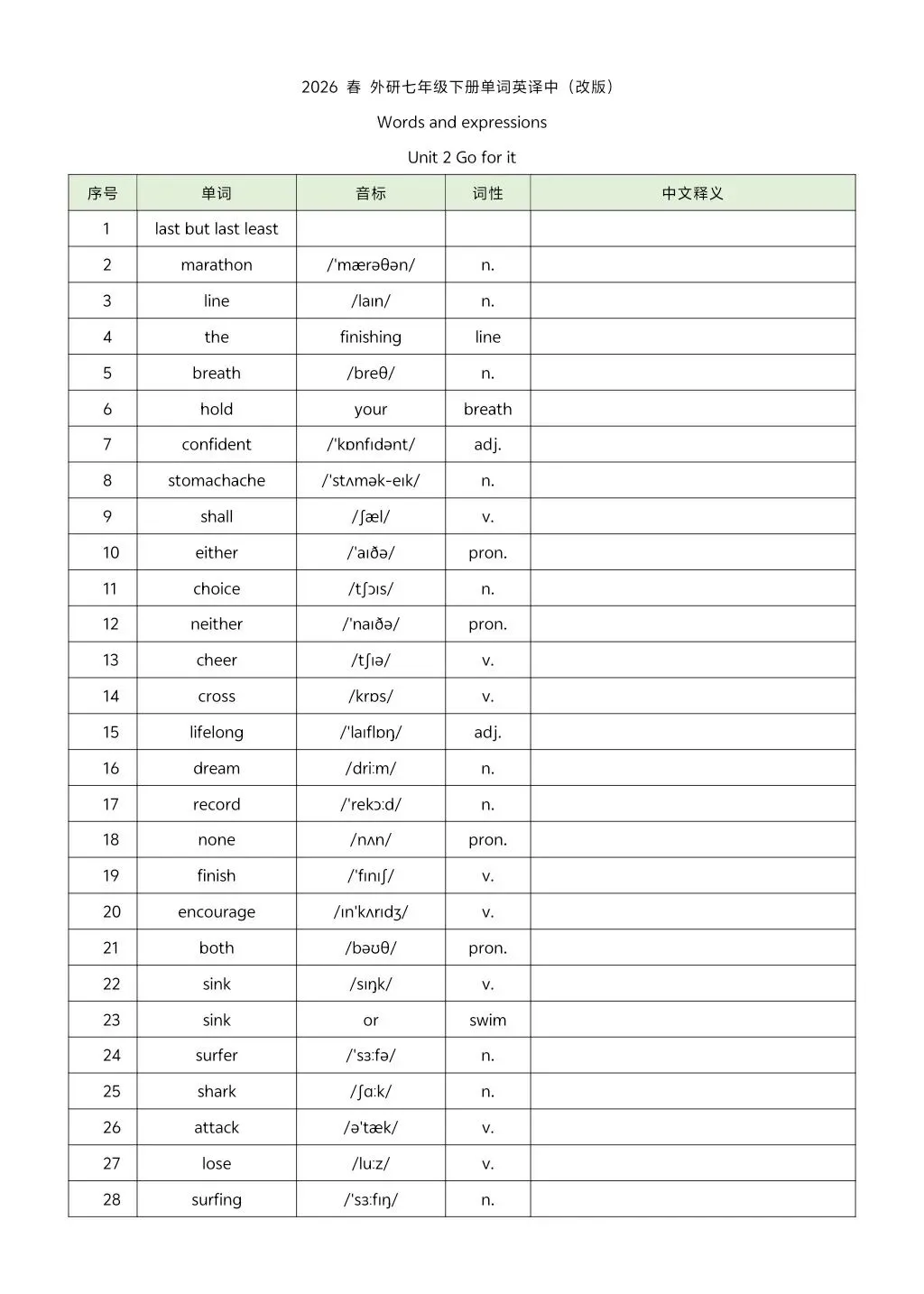 26年春七年级下册外研版英语单词表【汉译英+英译汉】,完整高清可打印