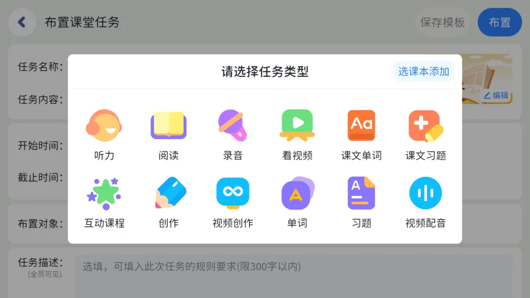 告别单一的作业形式。该APP支持听力、阅读、口语录音、单词背诵等多种作业与课堂任务类型。更内置上百个成熟打卡营模板,老师可直接套用,轻松实现创意布置,彻底解放备课精力。
