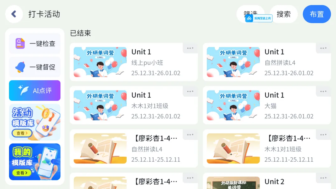 内置丰富打卡活动与社区运营模板,助力机构零成本开展招生引流活动。从布置、检查到督促,全流程智能陪跑,让教学与运营同步增效。