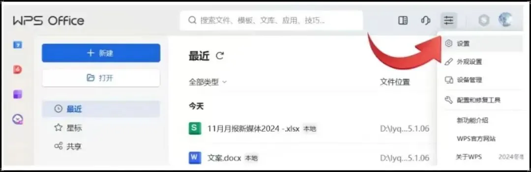1 、打开WPS主页,选择右上角的“三个横杠”,选择【设置】。