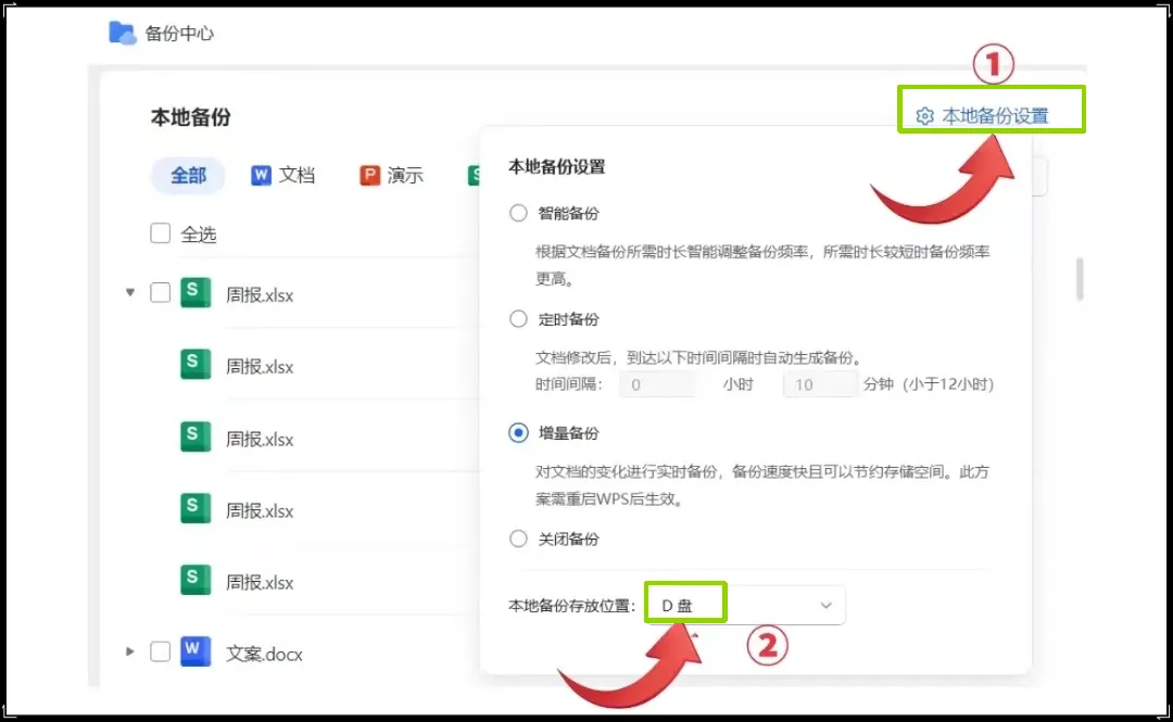 4 、在备份中心右上角【本地备份设置】中,把本地备份存放位置C盘更改至D盘。