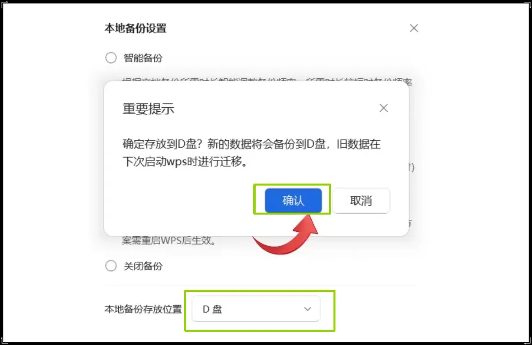 5 、确认重启WPS自动迁移,重启WPS,自动迁移备份文件到新位置。
