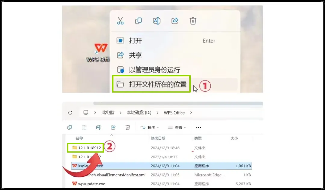 1、首先,右键点击WPS的桌面图标,点击【打开文件所在位置】,进入【第一个文件夹】。