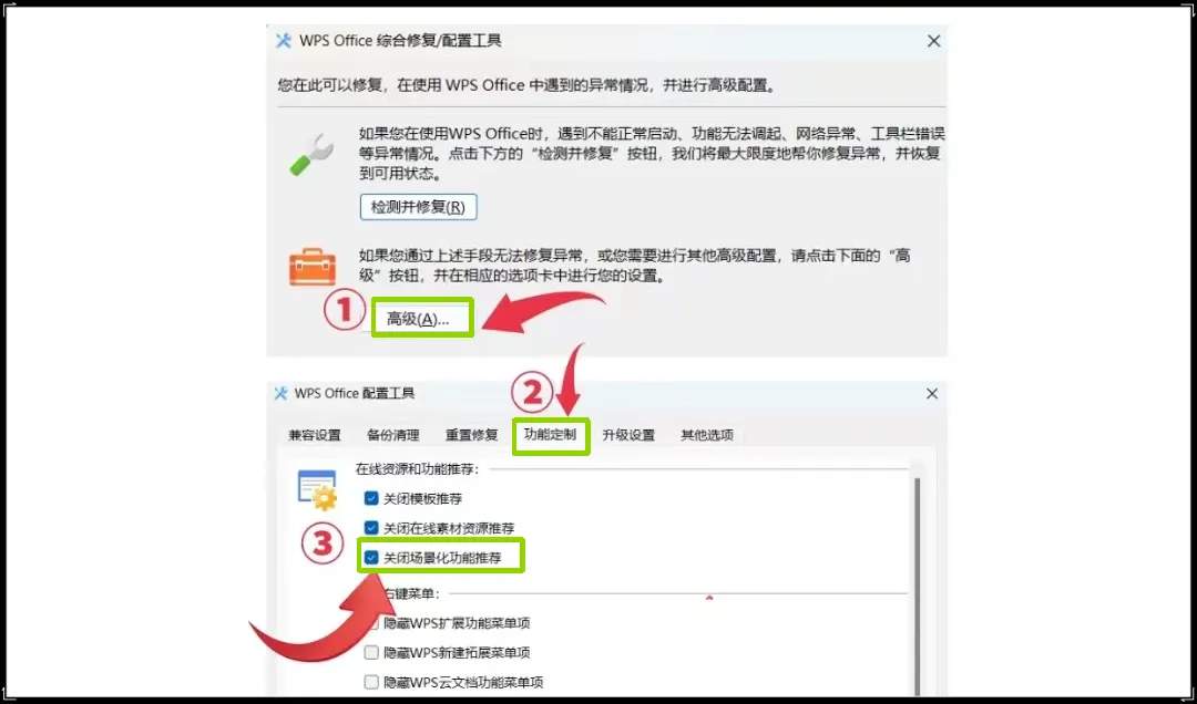 3、之后,左键双击打开【ksomisc】,点击【高级】,点击【功能定制】。最后,勾选图中所示的三个选项,再点击确定就可以了。