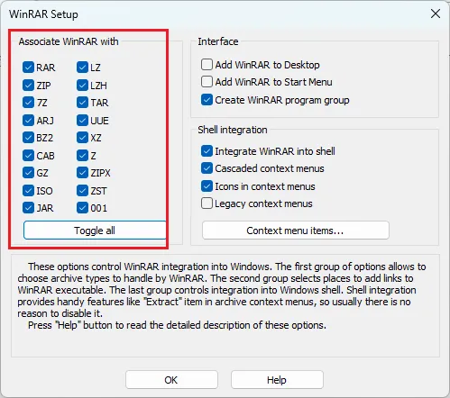 安装完毕后,可以选择哪些压缩包可以使用WinRAR解压,都勾上就完事了,其他的不需要动,
