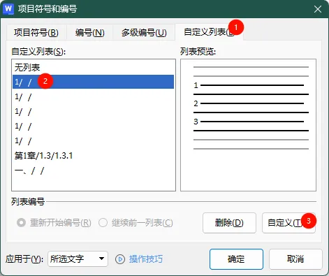 2.在弹出的对话窗口中,点击【自定义列表】,选中需要修改的列表样式,选择【自定义】。