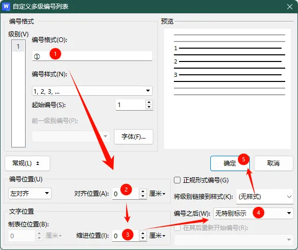 4.删除【编号格式】栏示例后的【.】,【对齐位置】修改为0,【缩进位置】修改为0,【编号之后】选择无特别标示,点击【确定】。