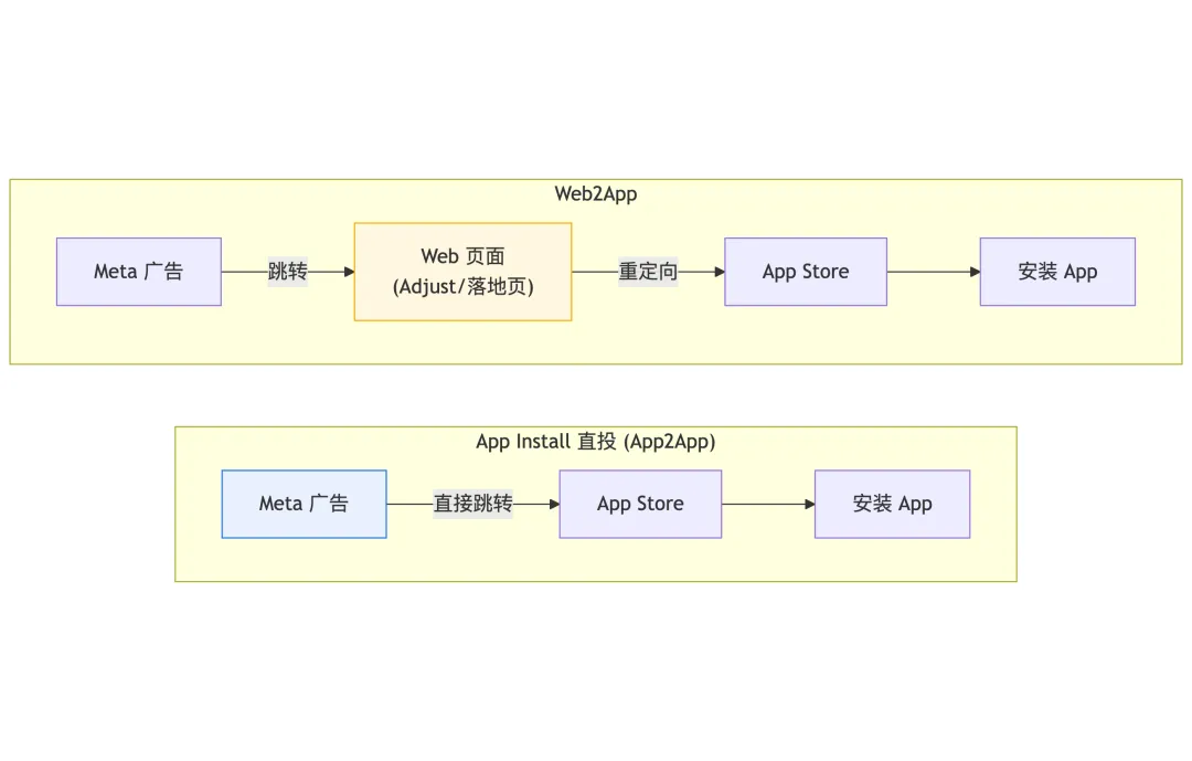 直投:广告 → App Store(1 步) Web2App:广告 → 落地页 → App Store(2 步)