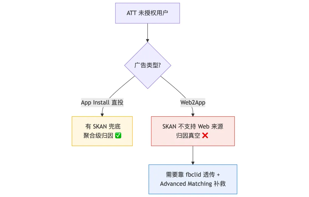 这是最大的技术挑战。上一篇讲过,SKAN 不支持 Web 来源的归因。也就是说,对于 ATT 未授权的用户,Web2App 广告既没有 IDFA、也没有 SKAN 兜底。