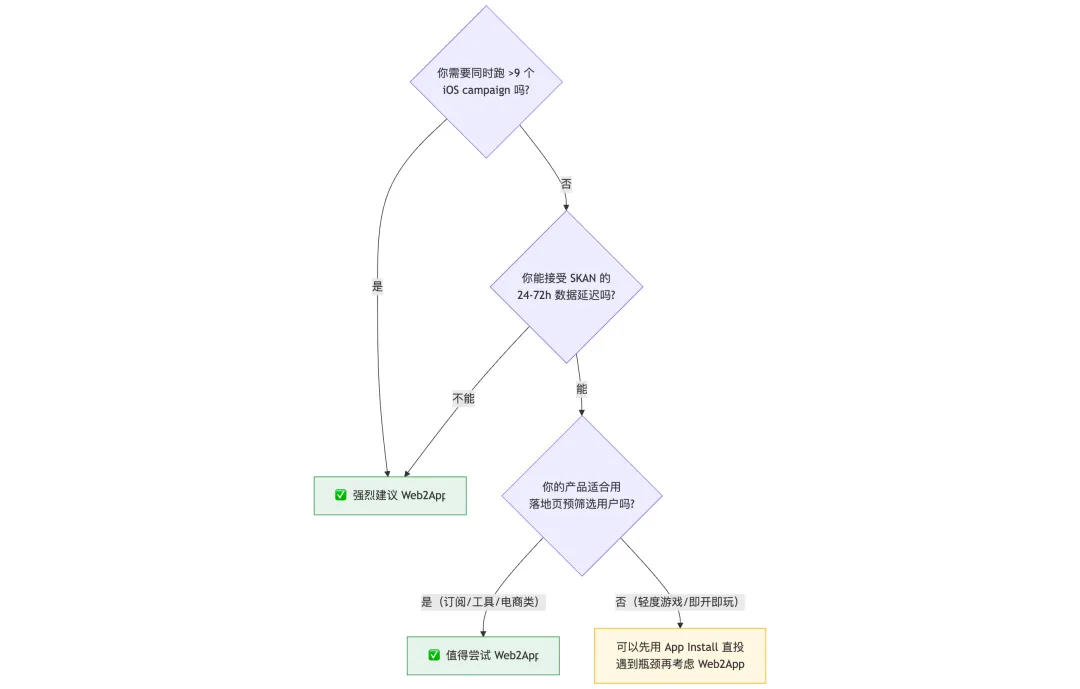 当你需要同时测试 10 个素材方向 × 5 个地区 × 3 种出价策略 = 150 个组合时,SKAN 的 45 个上限根本不够用。Web2App 没有这个瓶颈。