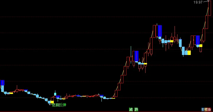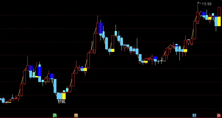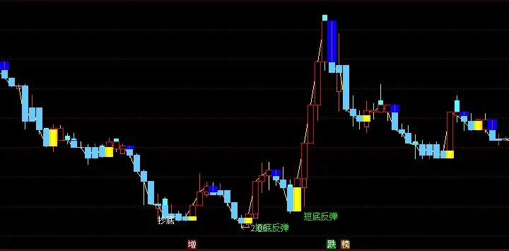 指标最终在图上标出两个明确的文字提示:”短底反弹“和”抄底“。它们不是凭空出现的,而是经过一系列条件筛选后的结果。